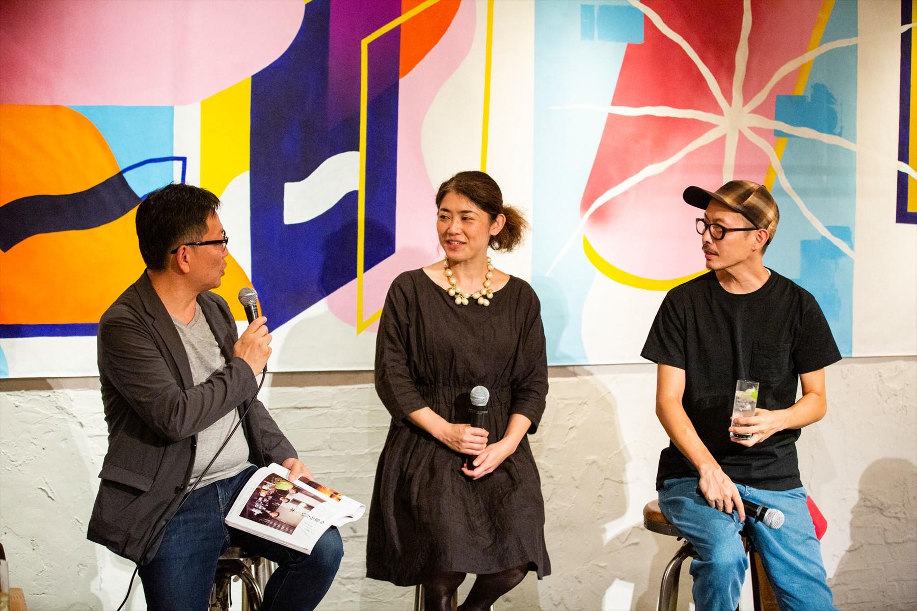 とっておきの催しはまだ続く。9月号にも登場した“ジン識者”のゲスト2名――ジンフェスの企画者で現在の国内のクラフトジンブームの牽引役である三浦武明さん(右)と、人気酒販店「いまでや」の白土暁子さん(中央)――を迎え、植野編集長と3名でのトークセッションが行われた。