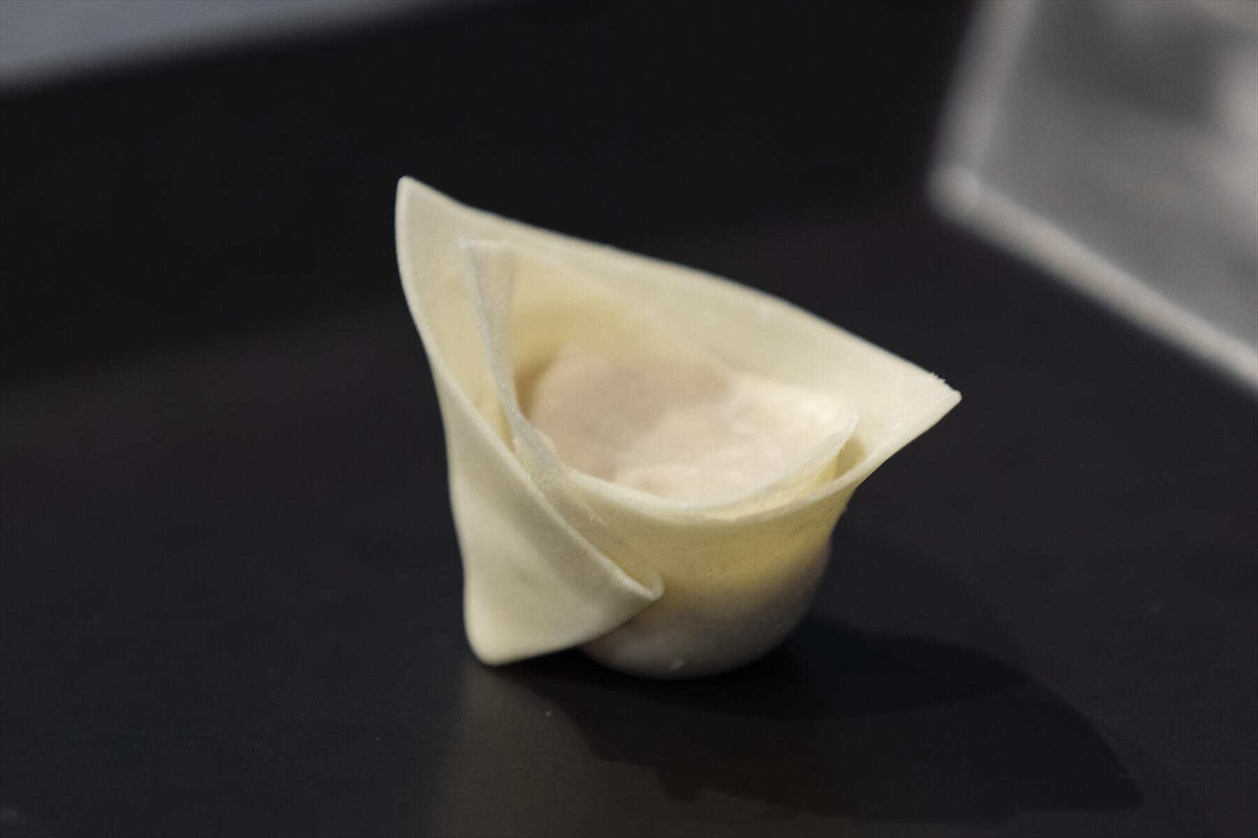 おそらく多くのメンバーが興味津々だったのが、ワンタンの包み方だろう。煮物やソースとは違い、ワンタンのように手の動かし方が気になる料理は、やっぱり動画で見てみたいもの。「仔羊クミンワンタン」は王冠型に、「鶏軟骨レモングラスワンタン」は皮のひらひらとした食感が楽しめる三角形にして、包み方を教わった。ちなみに、王冠型にする利点は、くぼみの部分に黒酢など調味料を注げること。立体感があって見栄えがいいのも魅力だ。