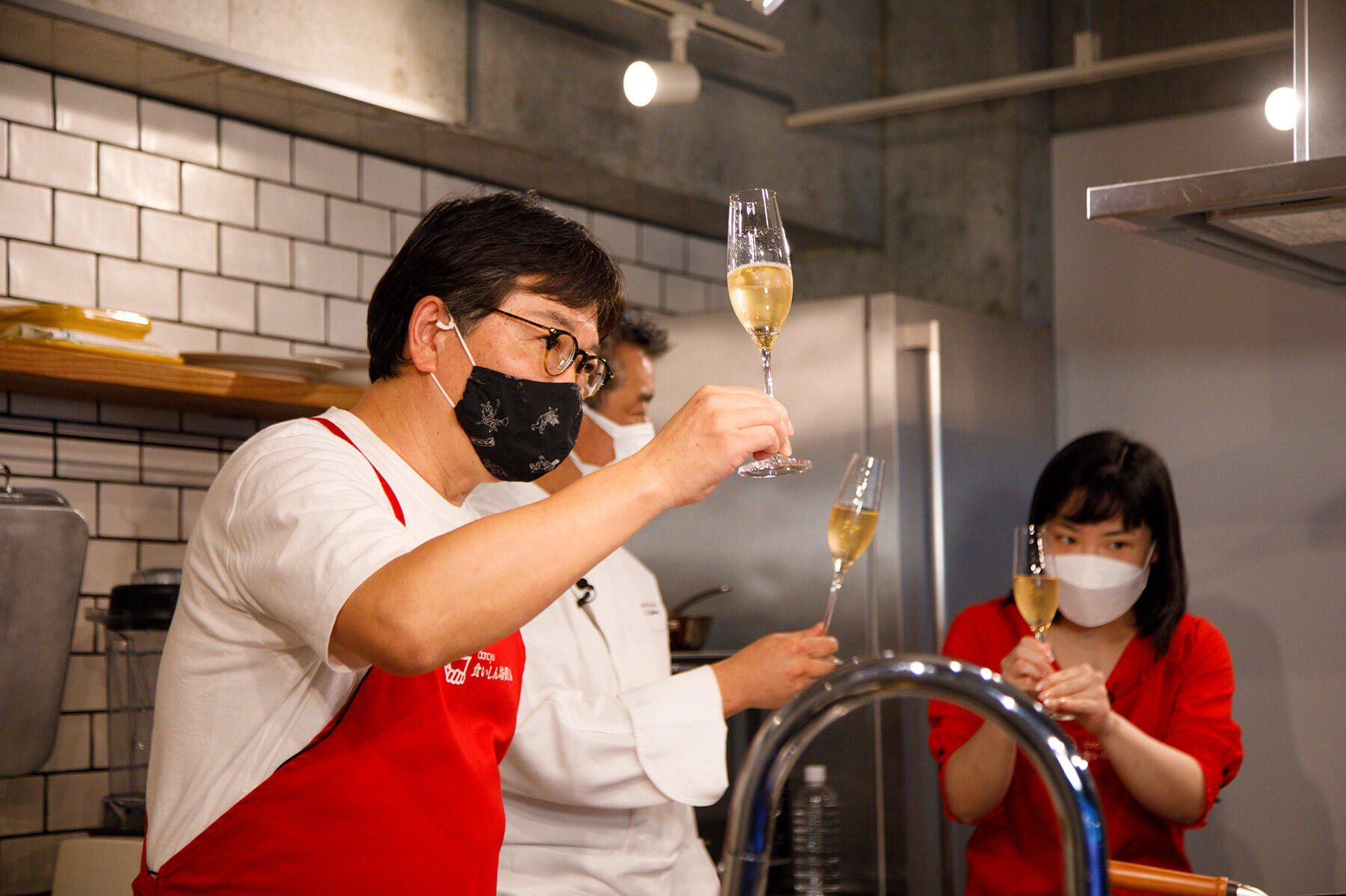高良シェフ、植野編集長、そしてアシスタントの編集部員神鳥の3人で、シャンパーニュ片手に乾杯からスタート。いつもより豪華な演出に、植野編集長のダジャレも滑らか。それにつられて高良シェフはペースを乱される?