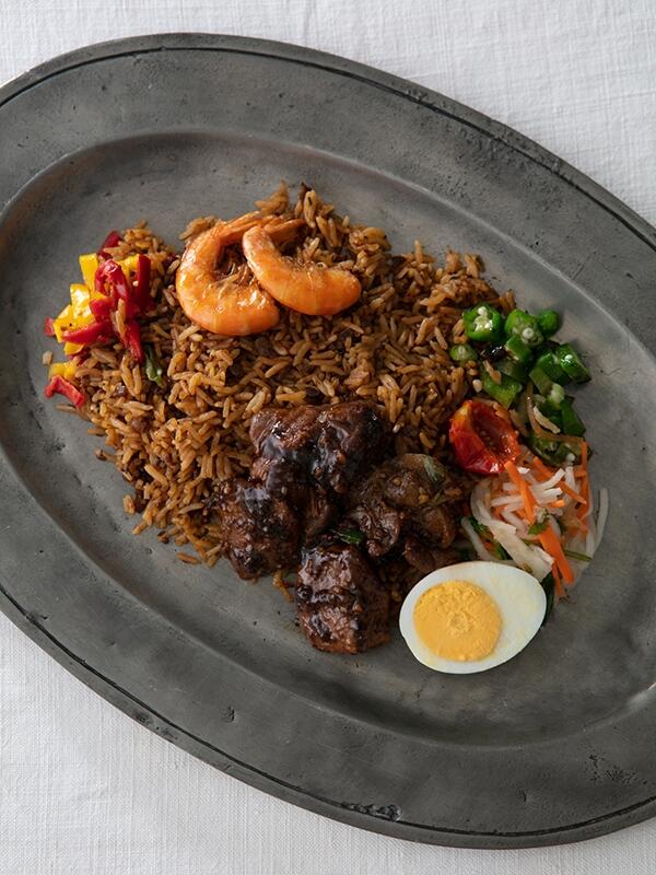 - ジャスミンライスの上に、艶やかな鶏肉“サテアヤム”、殻付き海老、人参と大根のなます、パプリカなど色鮮やかな具材がたっぷりのった、インドネシア、マレーシア発祥のナシゴレン。三河みりんの上品な甘味と香りを生かしたスパイシーソースが、全体をバランスよくまとめ上げます。(755円)