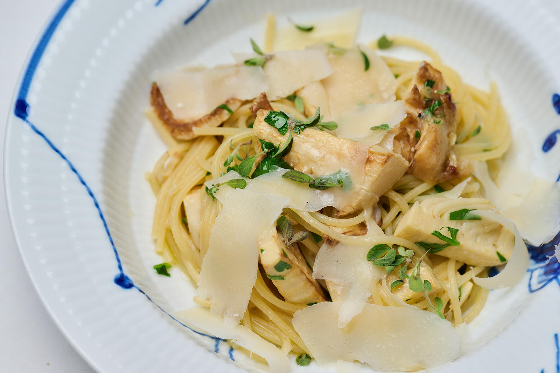 今回のメニューでは、パスタ2品のうちの1皿に合馬たけのこが登場。新たけのこならではの鮮烈な香りと軽快な食感を、シンプルに味わえるオイルソースでまとめた。