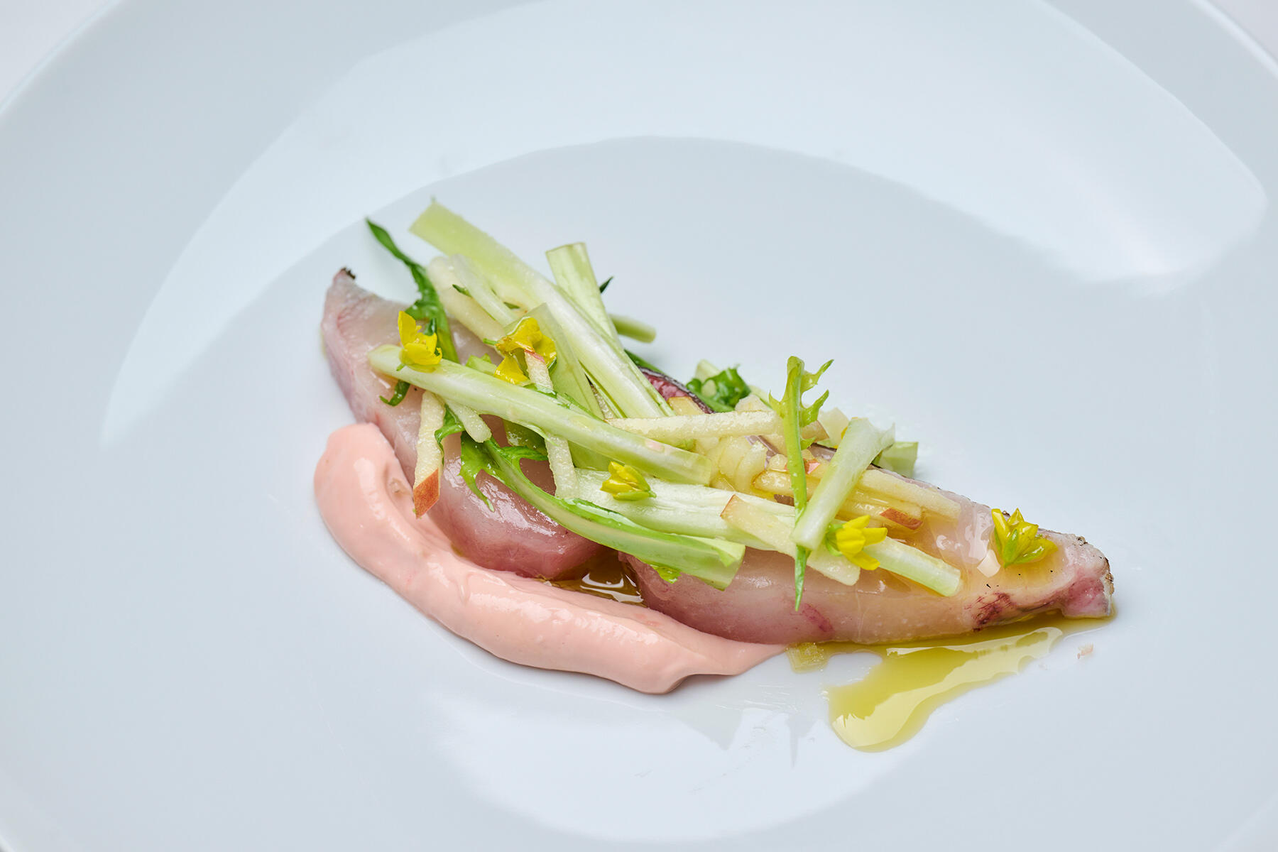 塩味、ほろ苦さ、甘味とサワラの旨味をつなぐのが、フランボワーズビネガーと卵黄を合わせた桜色のマヨネーズソース。口に運ぶと、魚、野菜、フルーツ、ソースがなめらかにまとまり、舌の上を春風が吹き抜ける。
