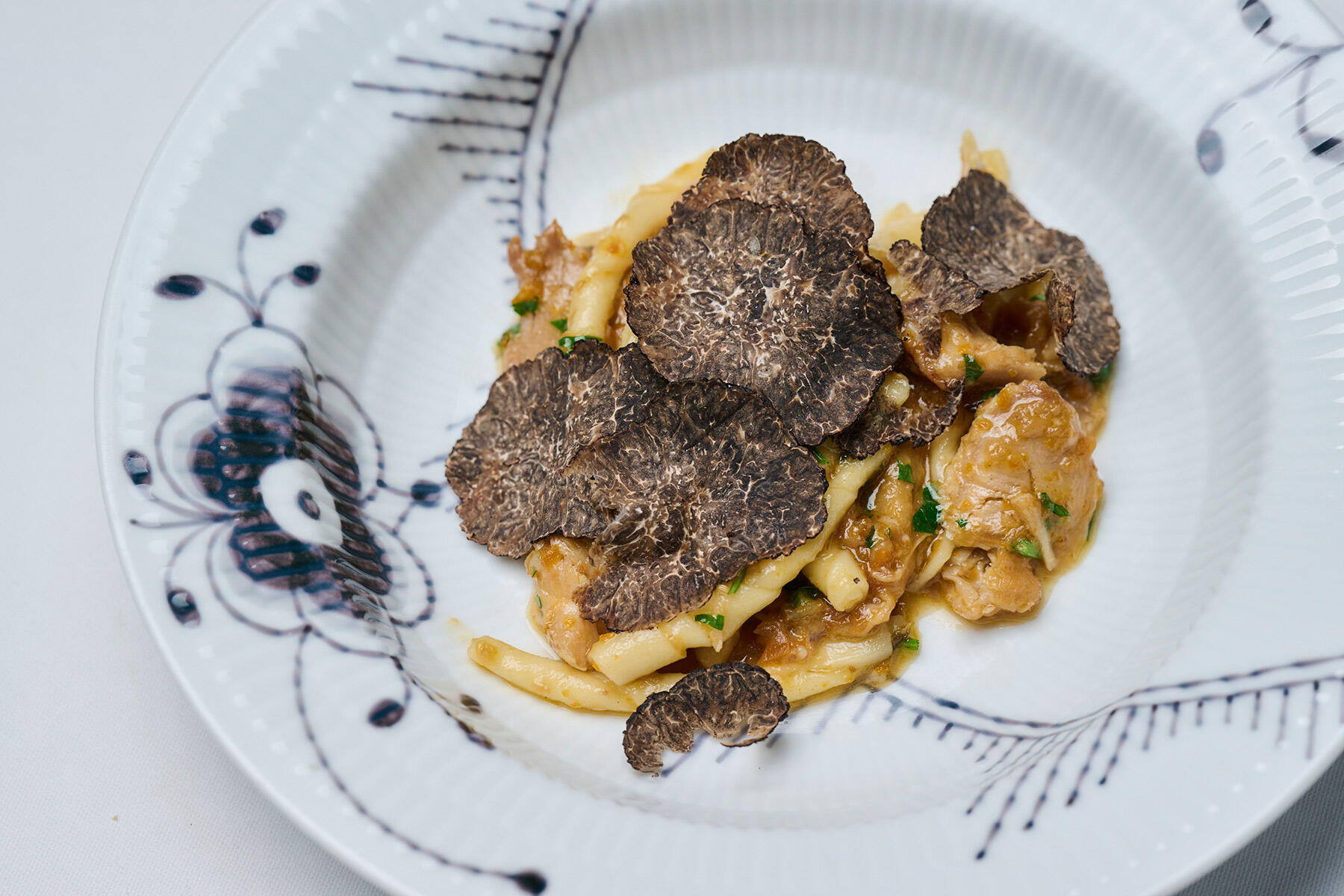 手打ちパスタには、「神父の首を絞める」の意味をもつという“ストロッツァプレティ”が登場(右)。ラグーは香味野菜のソフリットにケイパー、生ハム、トマト、白ワインを加え、はかた地どりとともにコトコト煮込んだもの。こっくりと深い味わいのソースが、ねじりパスタによくからみ、黒トリュフの複雑な香味も加わって後を引くおいしさだ。