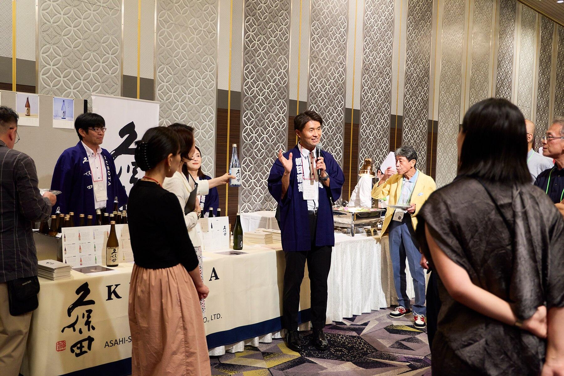 真っ先に日本酒ブースに向かった女性が、並んだ酒瓶を前にどの銘柄を飲もうか決めかねていると、担当者から「両方いかがですか」と薦められて破顔一笑。
