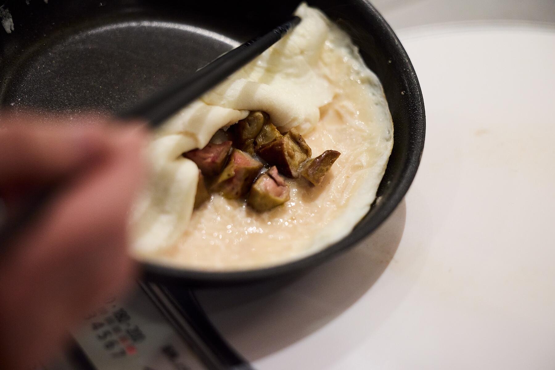 まずご紹介したいのは、会場で仕上げるふわふわの“トリュフオムレツ”だ。シェフがトロトロ半熟のベストな状態で次々と焼き上げる様子には、思わず目を奪われる。真っ白なオムレツは、無農薬玄米で育てた鶏の玄米卵の卵白を使用しているから。トリュフ&フォアグラで提供する。