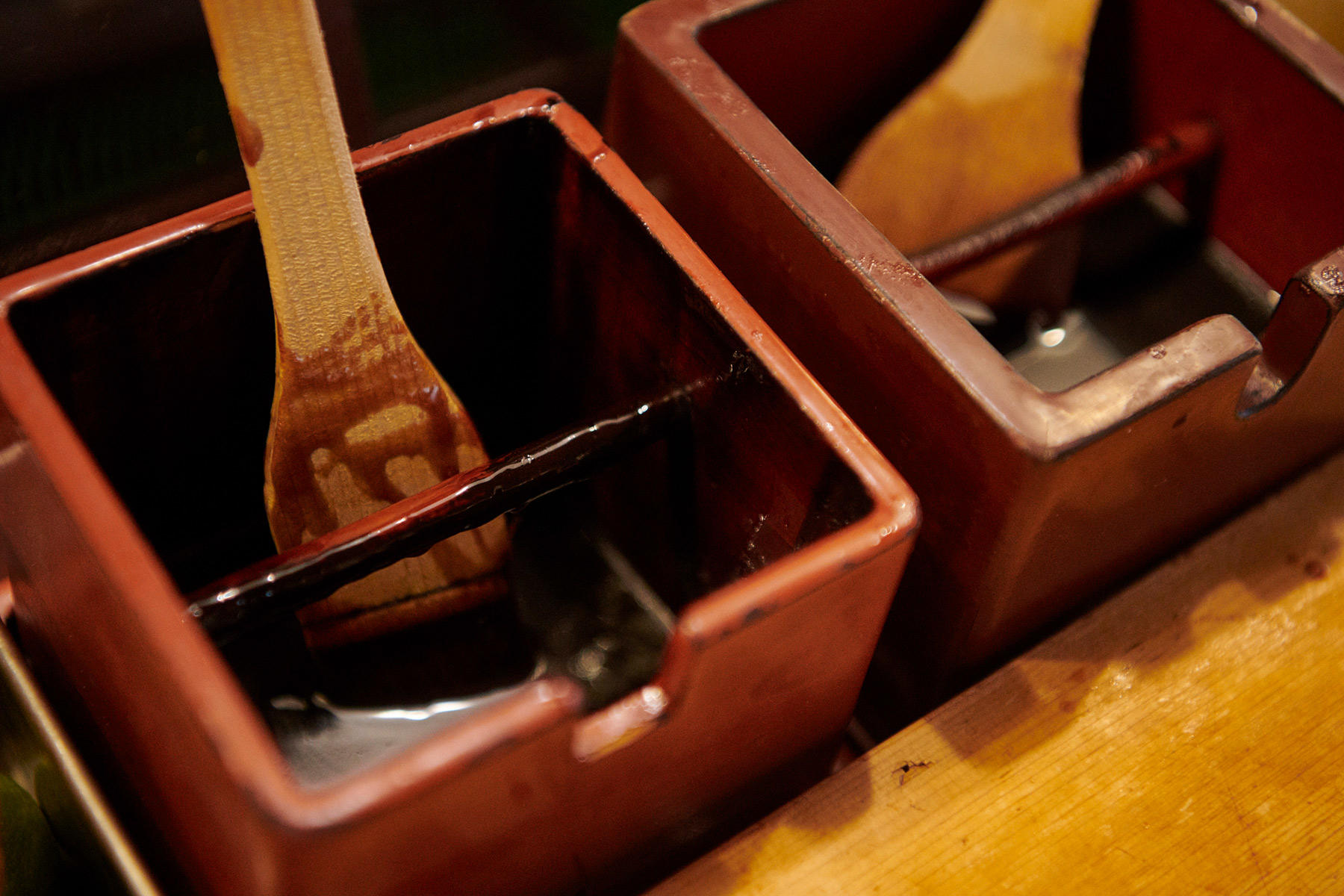 蛤を買って店に戻ると、漬け込みの仕事が始まる。使う蛤の大きさは殻付きで1個100g程度。まずは剥き身の蛤の水管に竹串を刺し、丁寧に何度も水で洗う。噛んだときに砂や貝の殻が少しでも残っていると、すべてが台無しだからだ。ぬめりが落ちた蛤を沸騰したお湯に入れ、ひと煮立ちさせる。このときの加減が鮨にしたときの歯触りを左右する。