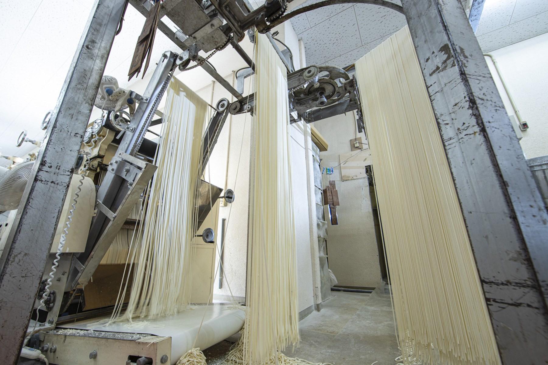 ミキシングが終わった小麦粉は、鋼鉄のローラーで板状に整形され、4つのローラーを通るうちに、少しずつうすくなっていく。最後に櫛形の歯を通り抜けて、生麺が完成すると、その先には篠棒と呼ばれる細い竹が待ち構えていて、すだれのように吊り上げられる。美しく真っ白なすだれは、そのまま二階の工場からオートメーションで、垂直に三階の干し場へと運ばれていく。