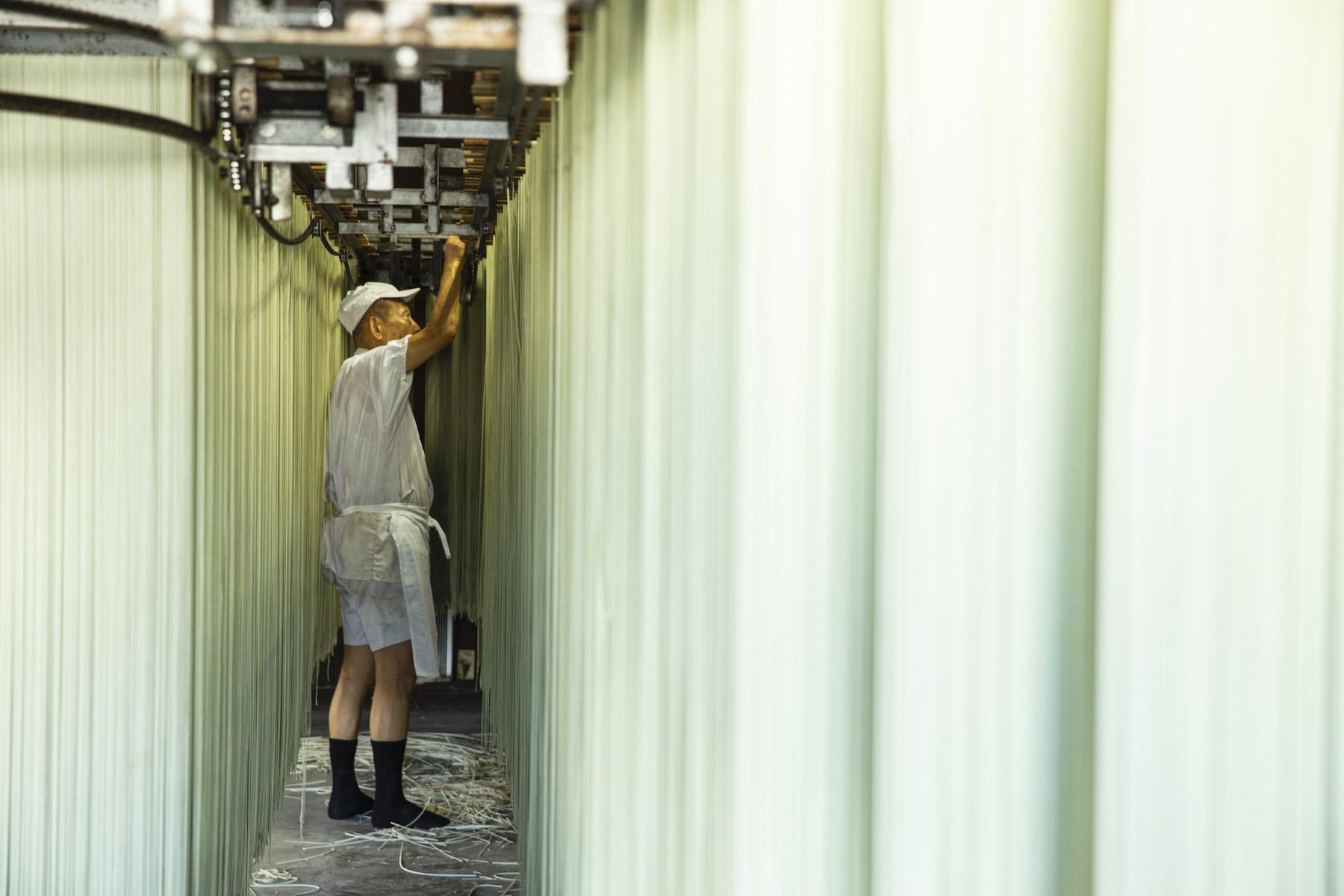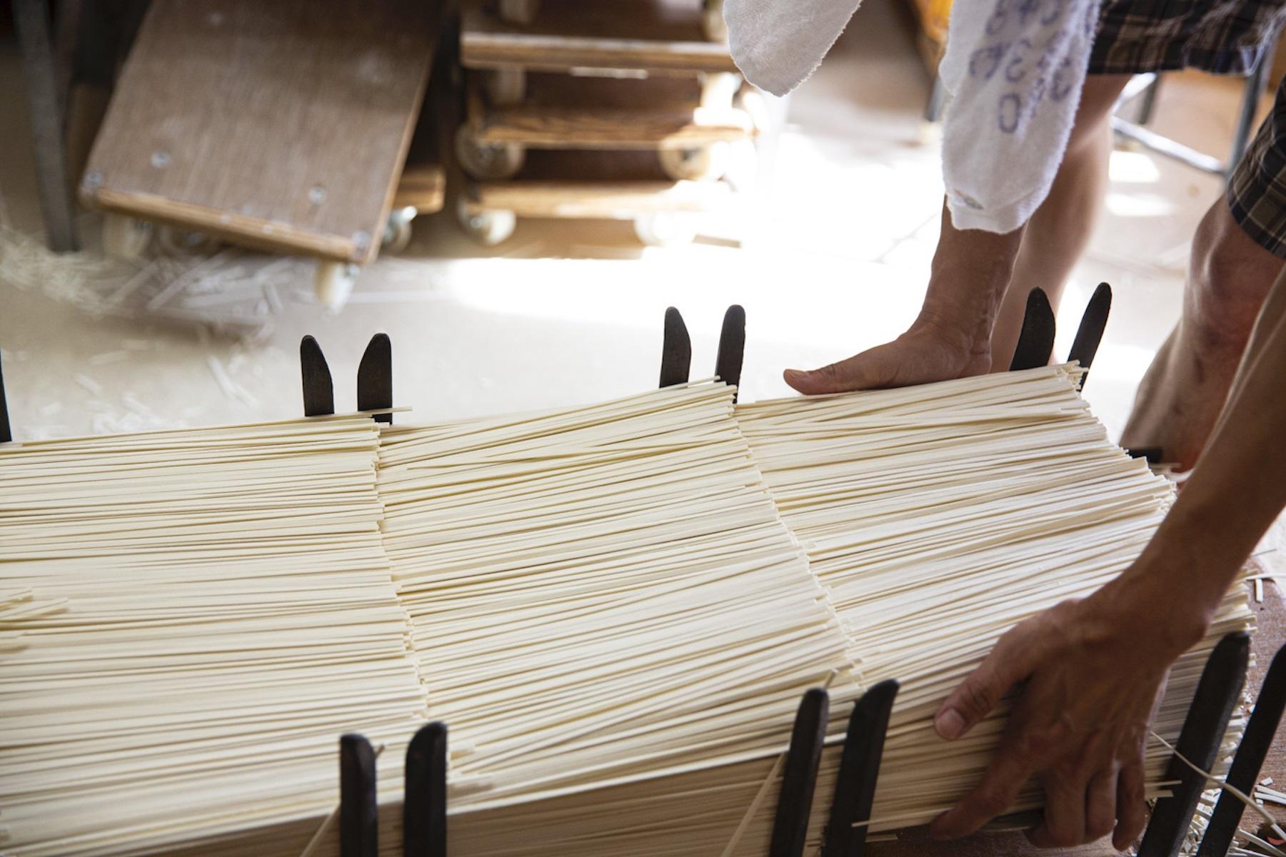 ムッとする暑さに、じんわり汗がにじむ。状態の良い麺をつくるには高い湿度を保つ必要があるそうだ。ギラギラと太陽が差し込む真夏だろうと関係はない。