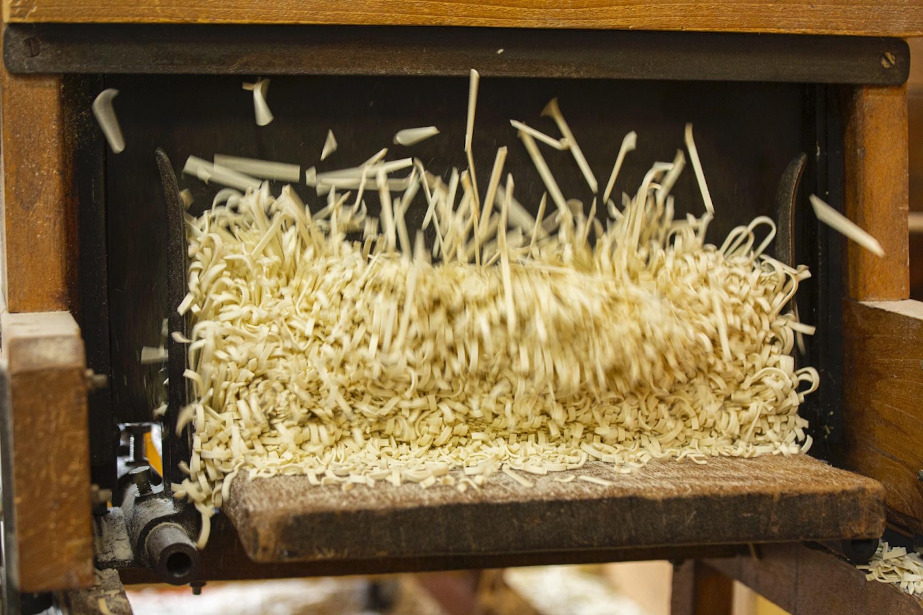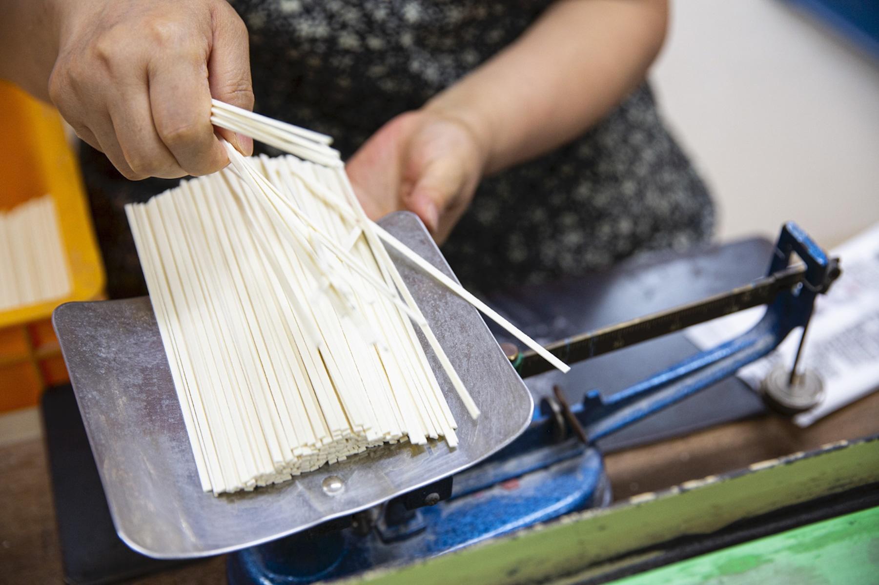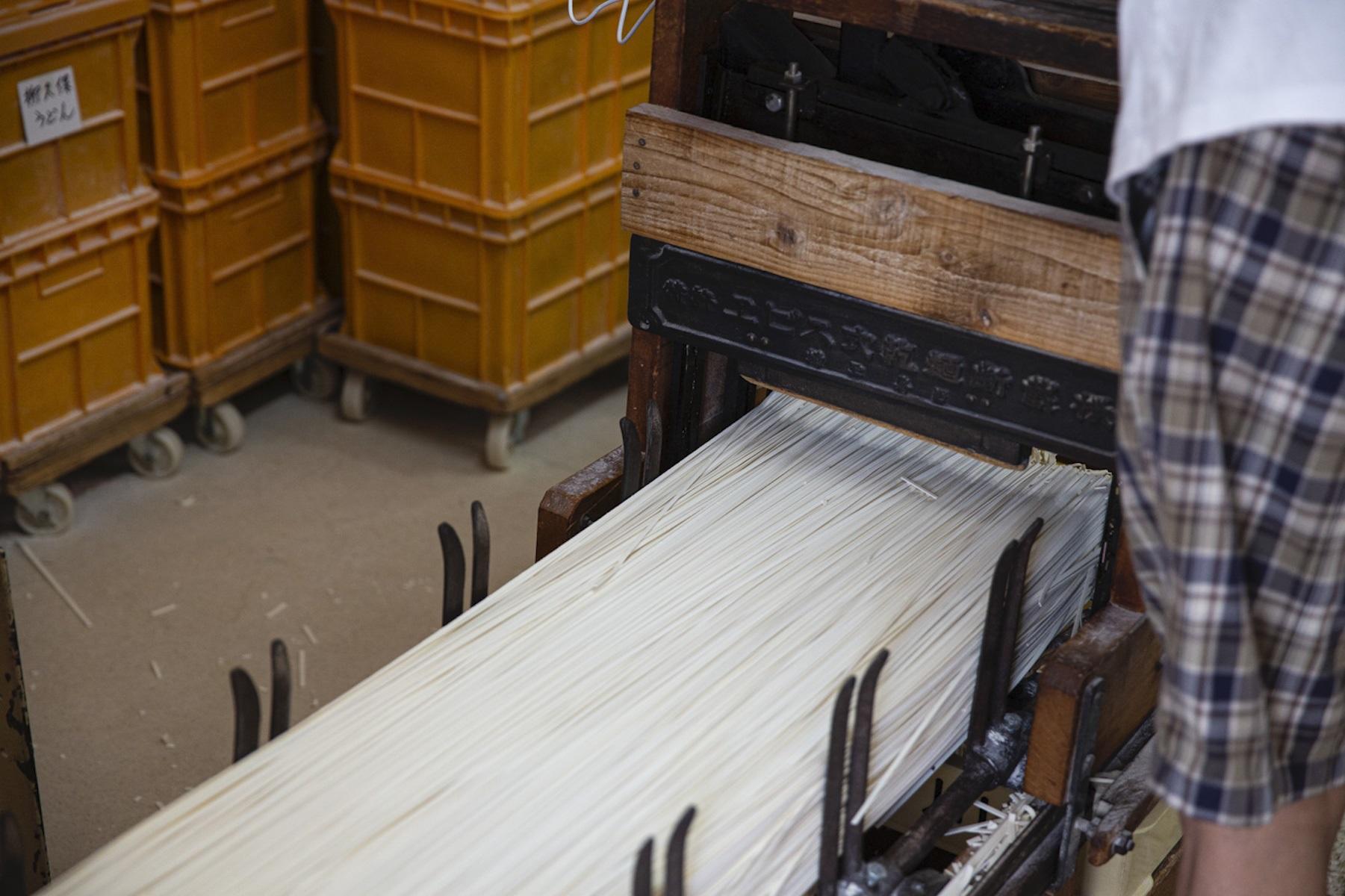 干し場で24時間過ごした麺は、水分量が12%~13%の水分量になっていて、保存するのに理想的な状態。創業時から80年間使い続けているという裁断機で、すべての麺を手切りしていく。寸分違わない長さに揃った乾麺を秤で分けて梱包すれば「満さくうどん」が完成する。