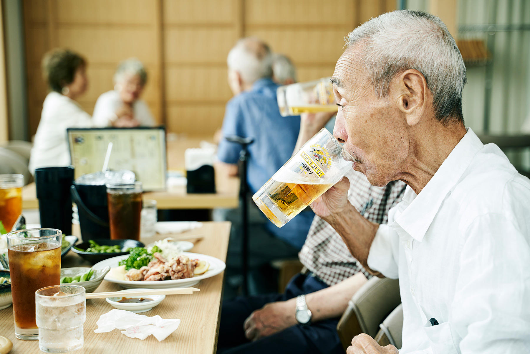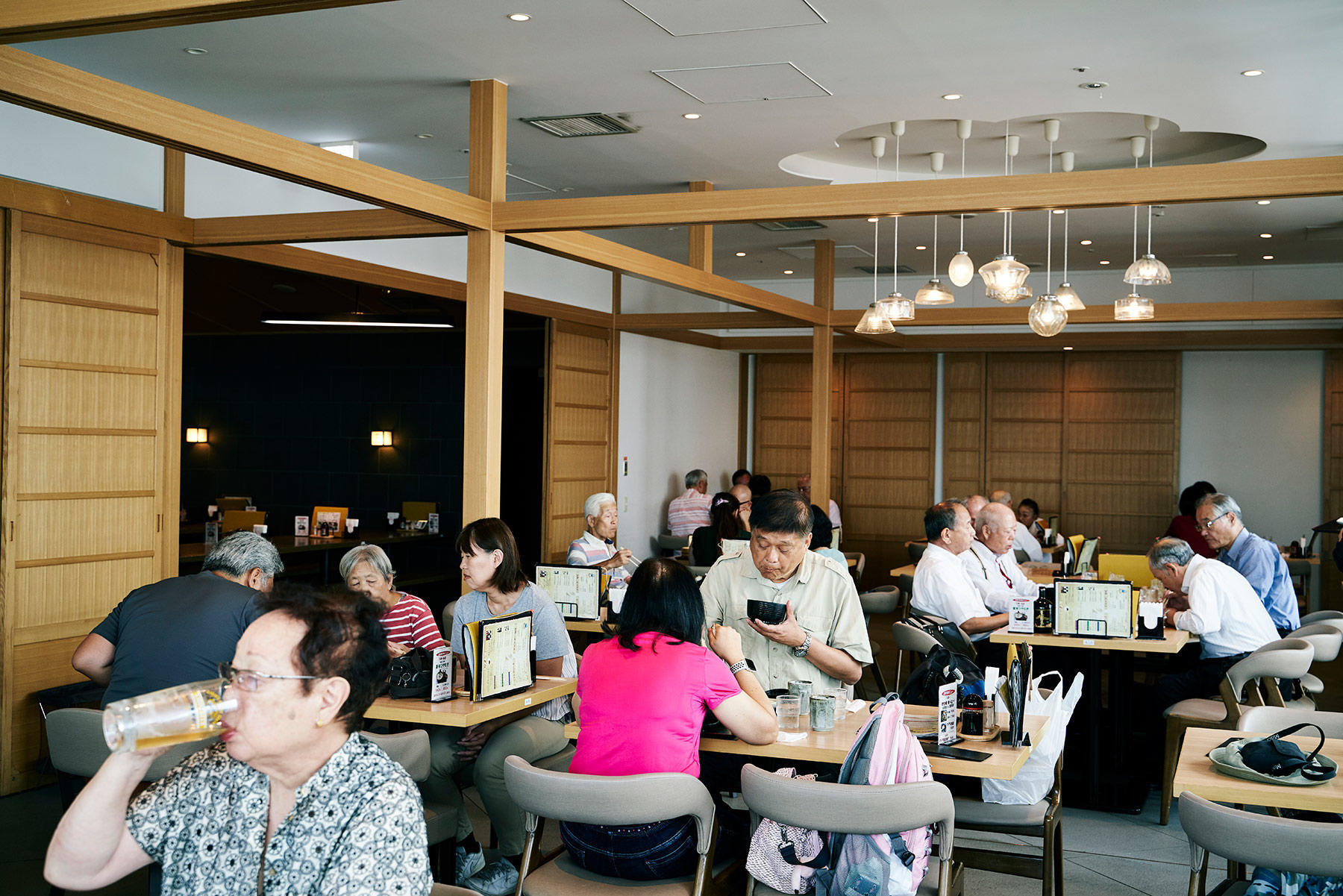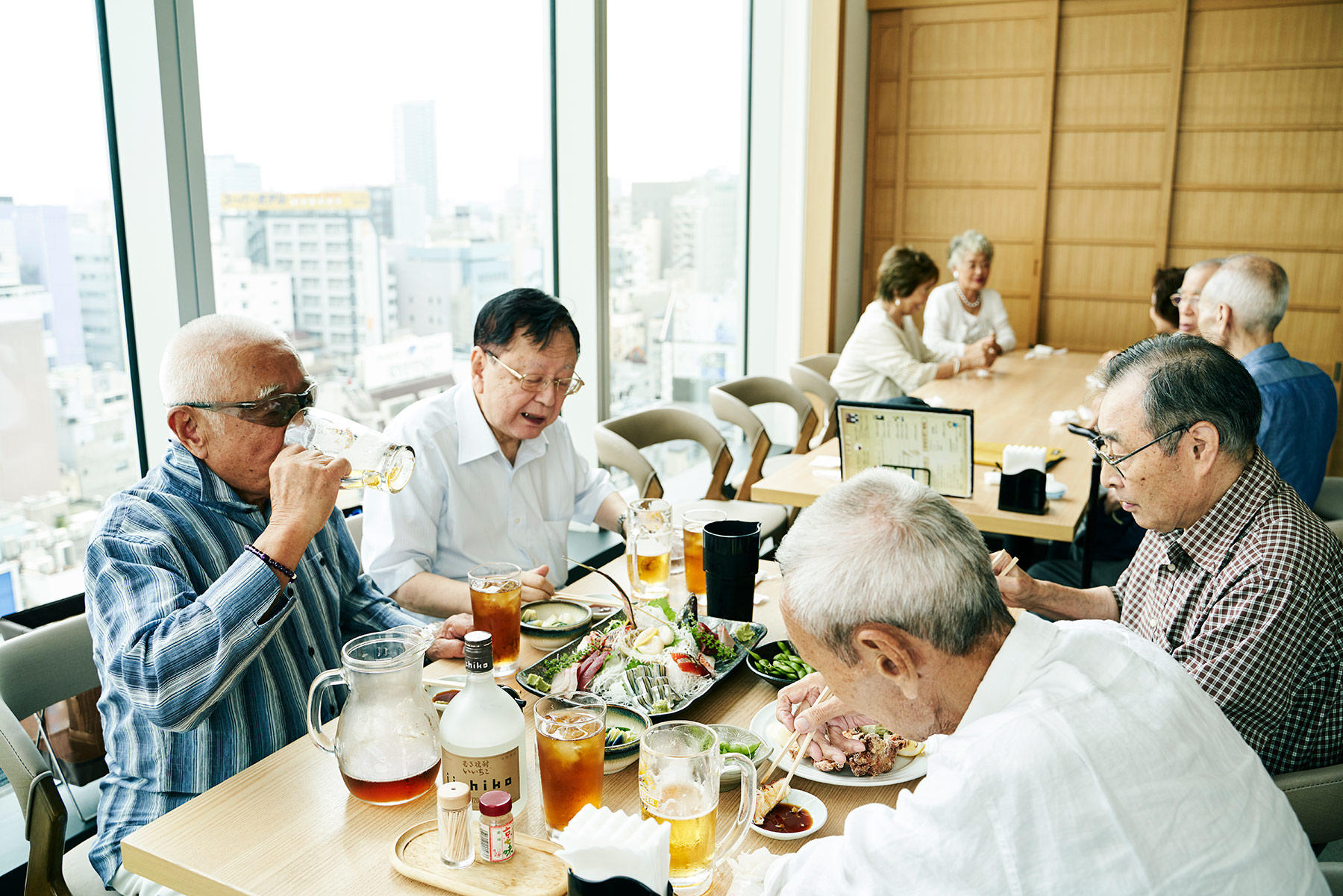 同級会か、OB会か、おじいさんの団体席には、両はしに一升瓶がどんと置かれている。