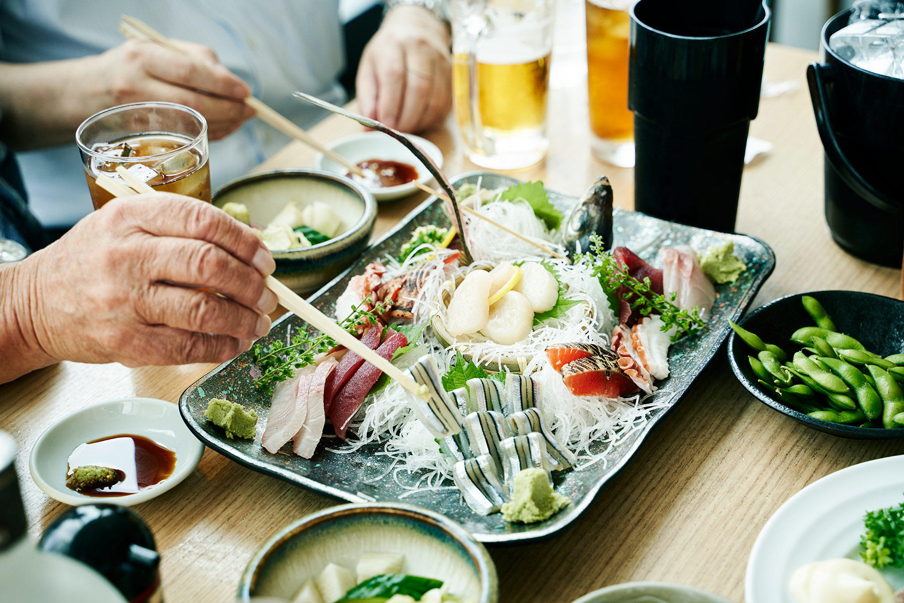 お店のひとたちは、おさけも、ワインも、ビールも、ご膳もどんぶりも、しずかにすばやく運んでいく。