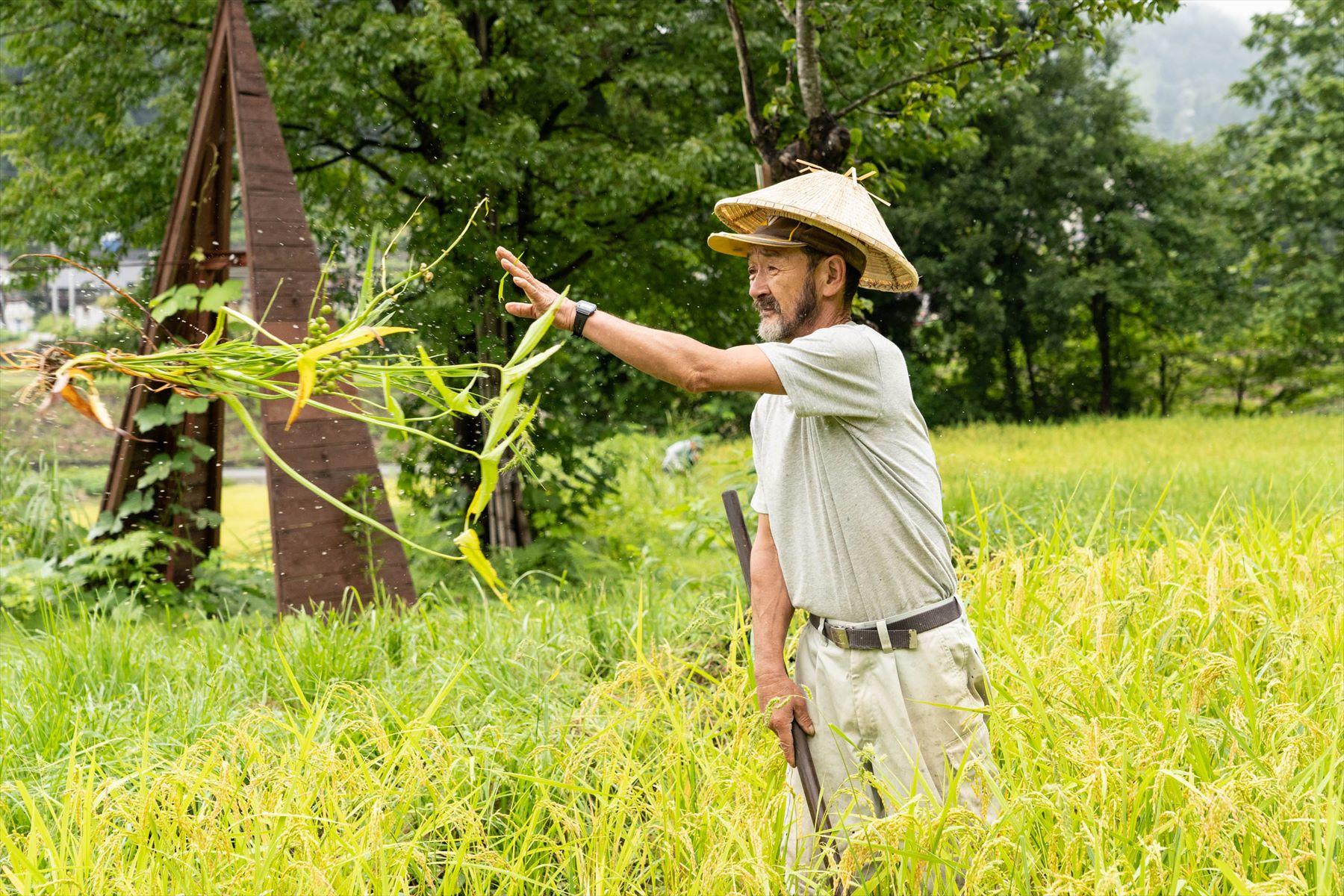 彼は長い柄の鎌を手に取ると、ヅカヅカと田んぼに入ってきた。そしてものの見事な鎌さばきで、草を刈り始めた。