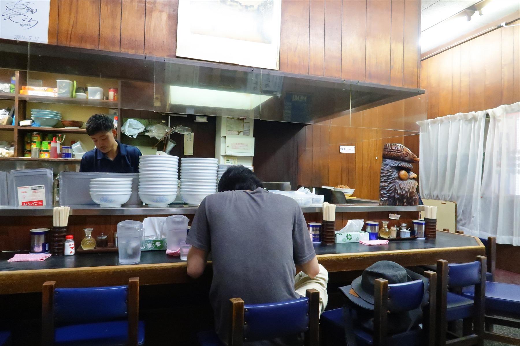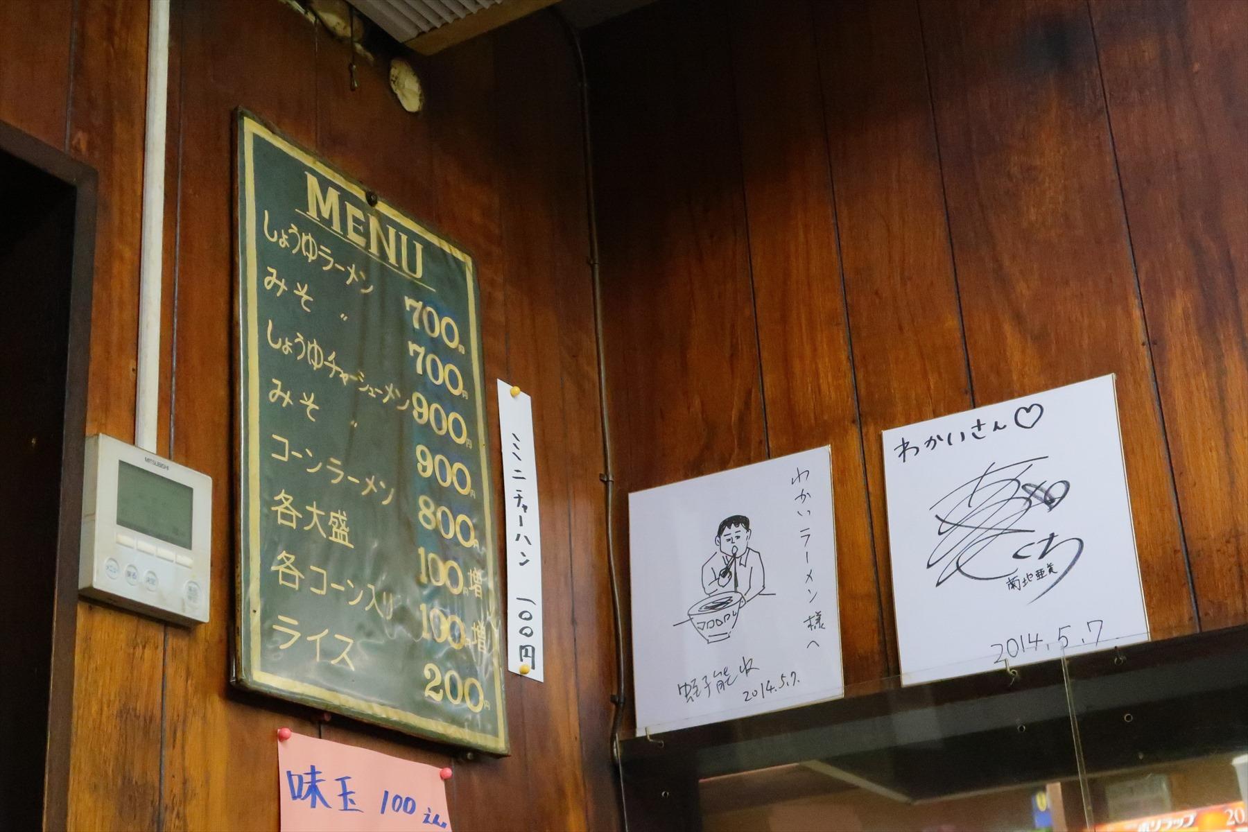 さっきのラーメン店「わかい」に戻ると、まだ客がふたりいた。構わぬ。進め。引き戸を開ける。厨房には若いイケメンがいた。接客係はお婆さんというには失礼な、でもそれなりにお年を召された女性だ。企画の主旨を伝え、取材をお願いすると、おばさんはちょっと戸惑った顔をしたが、「いいですよ」と言ってくれた。はあ、よかった。急に緊張がゆるむ。丁重に礼を言って席につき、店内を見回した。
