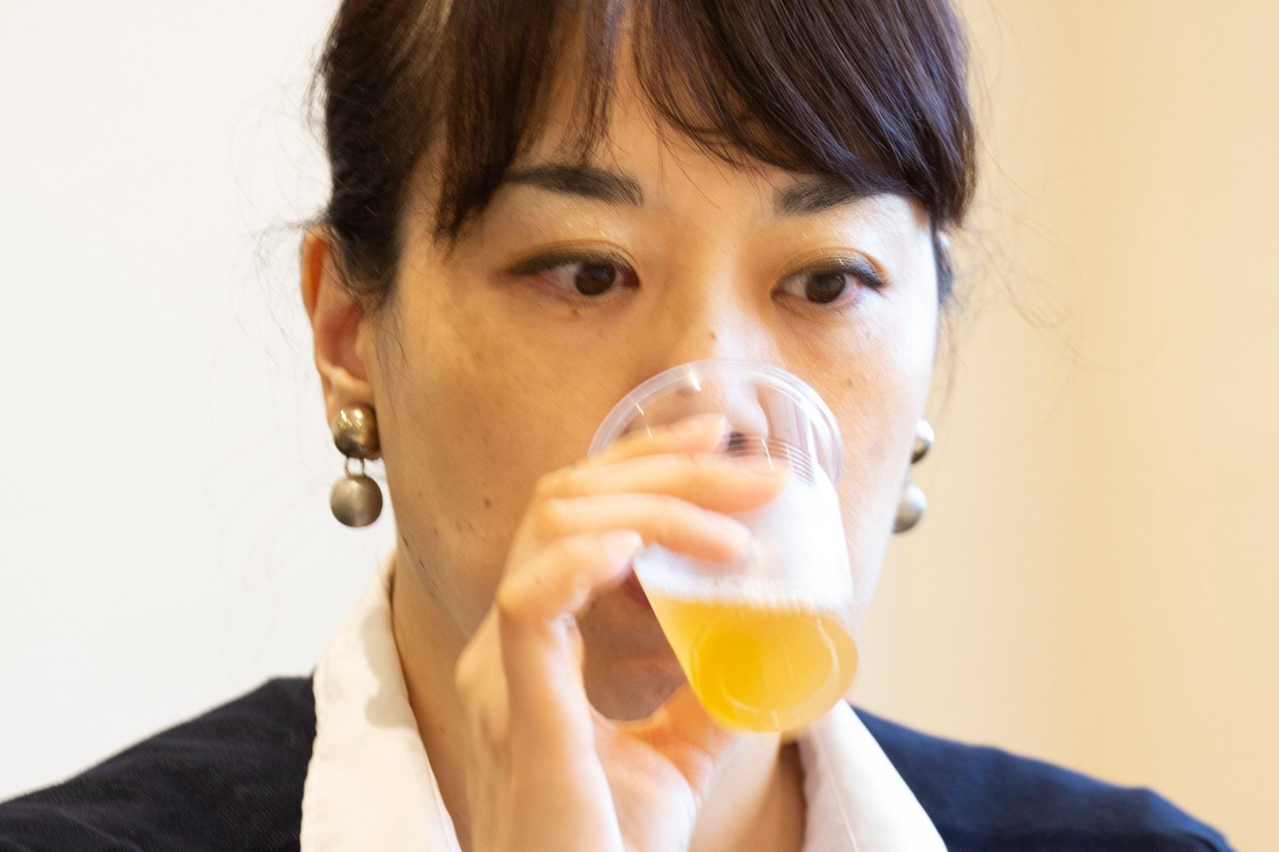 熟成前の「本麒麟」の無濾過を試飲する。「ミルキーな香りがします。熟成をしていないだけで、まるで違う飲み物のように感じます」と吽野さん。ワインエキスパートの資格も持つ料理研究家らしい意見だ。