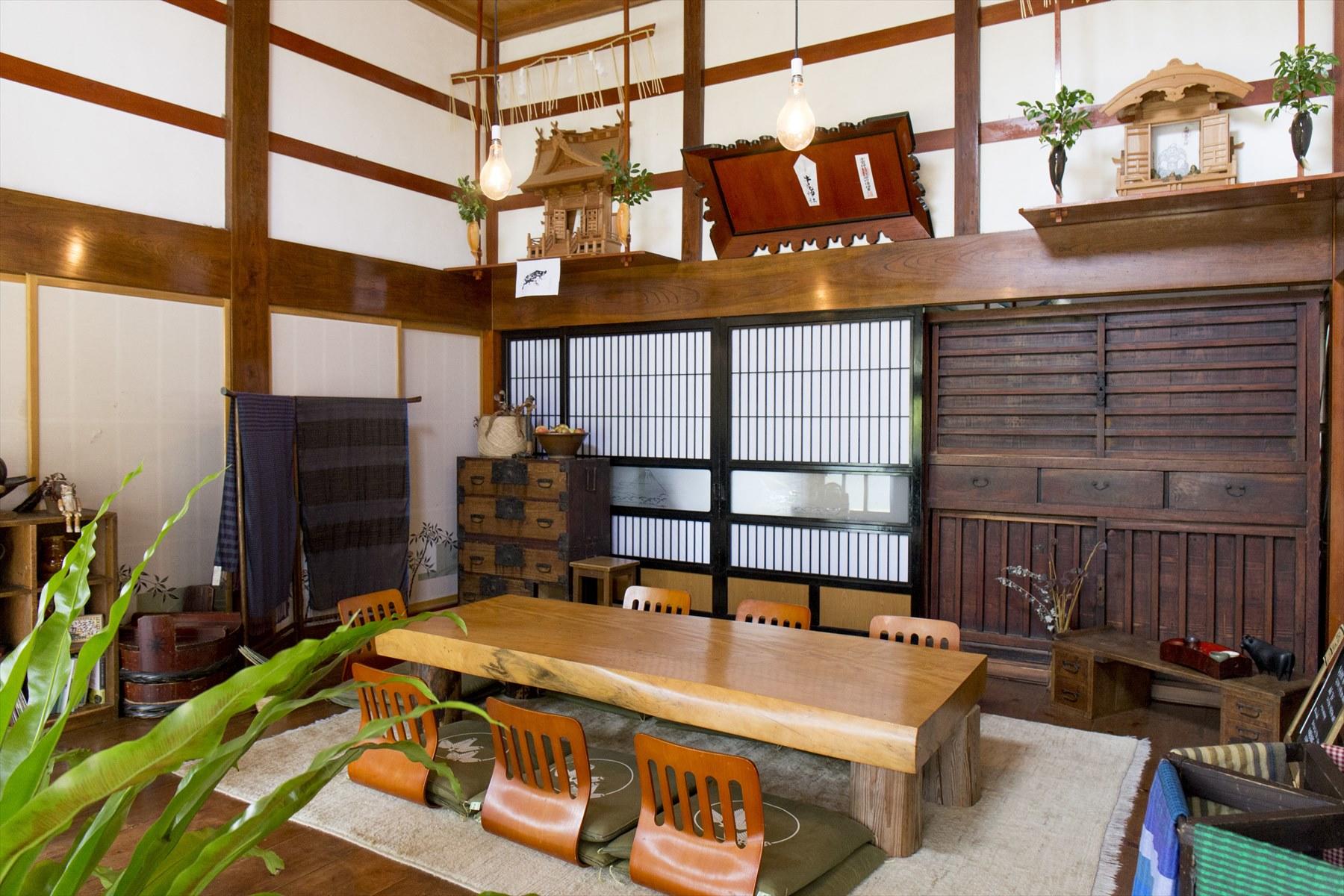 小物をディスプレイする棚は廃校になった小学校のランドセル入れ。もともと畳敷きだった居間の床板をはがして土間にした空間。そこに置かれるテーブルは、この古民家で穀物を納めるために使われていた「せいろ板」で制作。蕎麦をゆでる道具たちもまた、佐渡の職人が地元の竹でつくったものである。