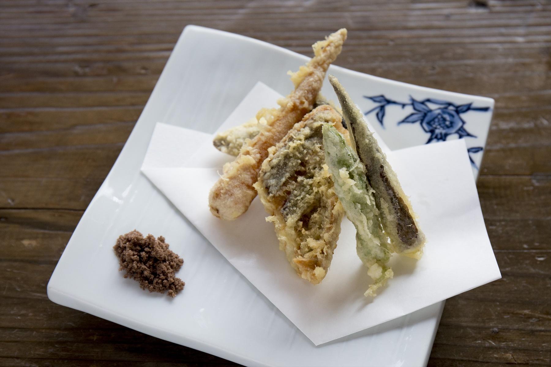 秋から冬は、蕎麦の実とカボチャのすり流しに絡める食べ方や、手製のねり胡麻を鍋に入れる“胡麻だれ鍋”で提供。雪が積もる前のふきのとうが採れる時期には、ふき味噌を仕込み、鱈をふき味噌田楽でも味わえるという。