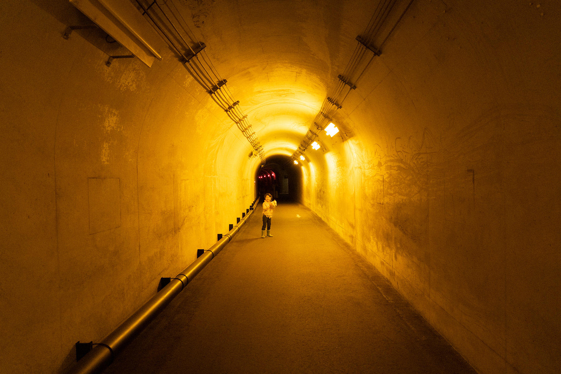 「清津峡渓谷トンネル」は歩行者専用で、全長が750mもあるという。端まで長い道のりも、稲刈り前のいい準備運動になるはずと、中へ足を踏み入れた。