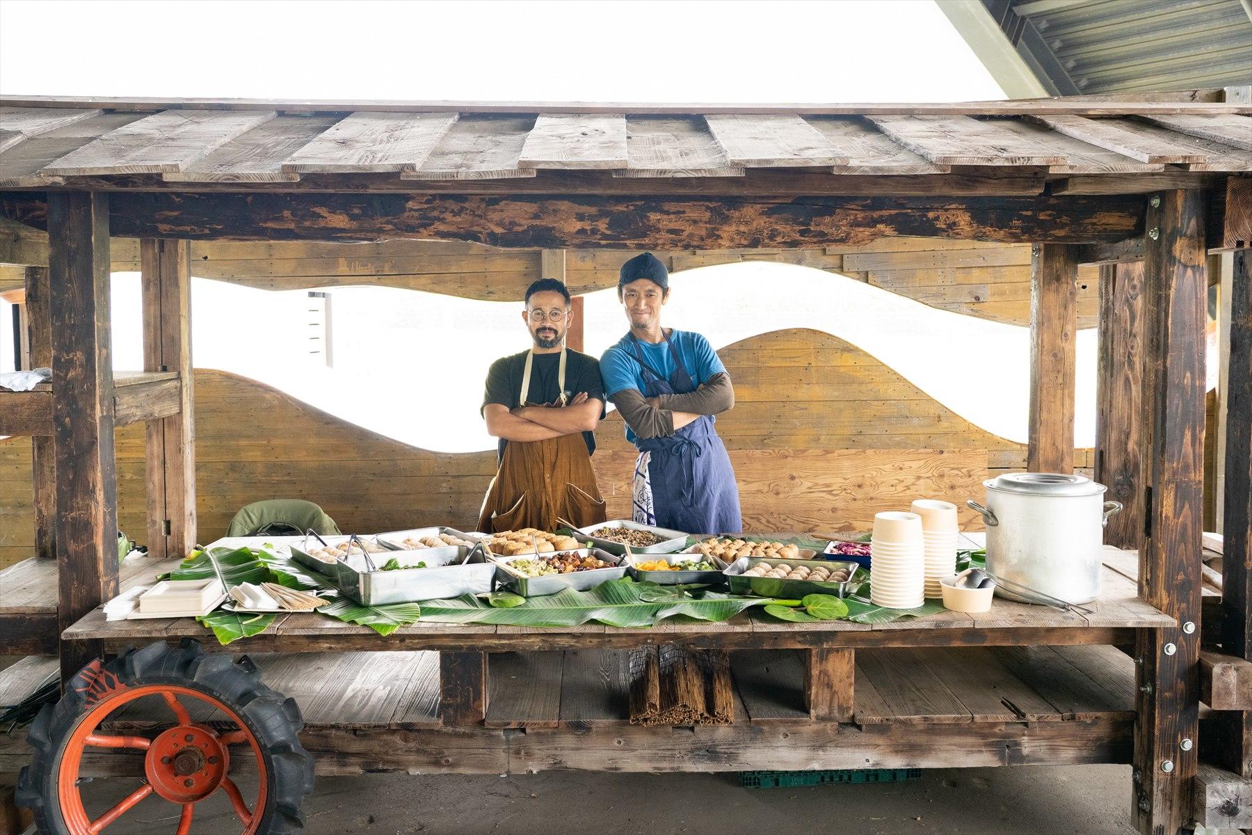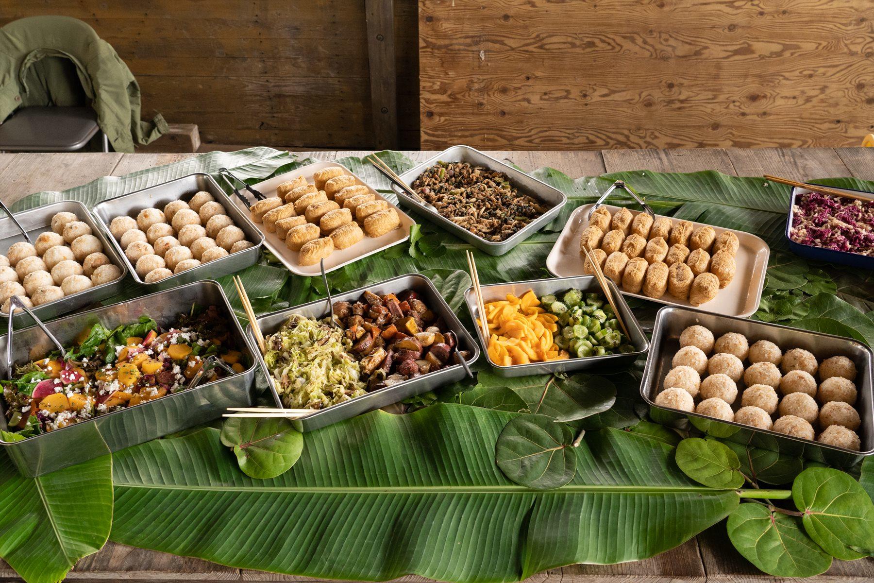 5月末の田植えに引き続き、秋のイネ刈りにも料理家のマツーラユタカさんからお昼ごはんが届いた。今回は「青果ミコト屋」の鈴木鉄平さんも、珍しい伝統野菜の料理を持参してくれた。稲刈り隊の面々も、このランチを心待ちにしていたようで、みんなに笑顔が広がっていく。