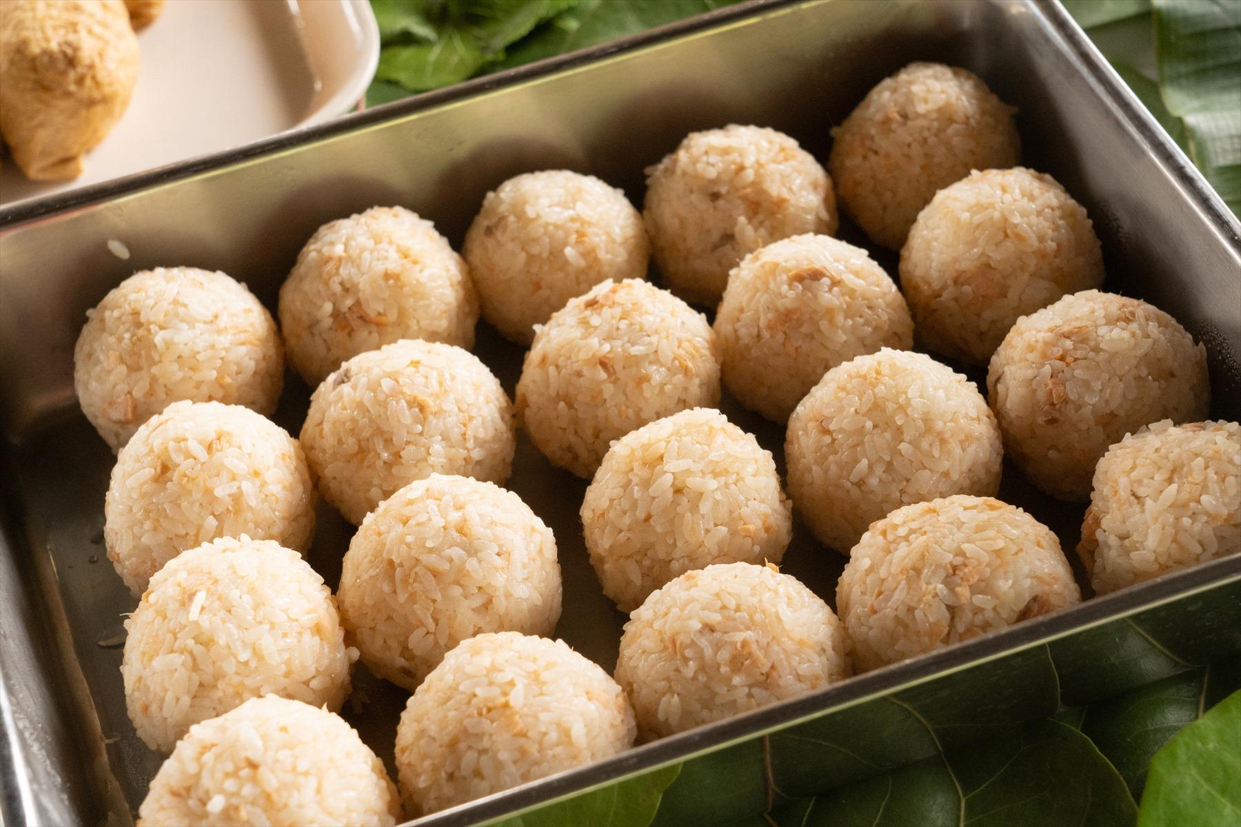 ごはんは黒酢と一緒に炊き込んだ鮭のおむすびと、梅酢で炊き込んだお稲荷さん。おむすびの米は冷えても旨い、というものでなくちゃダメ。アツアツの炊きたてごはんは、たいていの米がおいしくいただける。しかし冷や飯はそうはいかない。やっぱり粒に保水力があって、旨味を残すものでなくてはね。