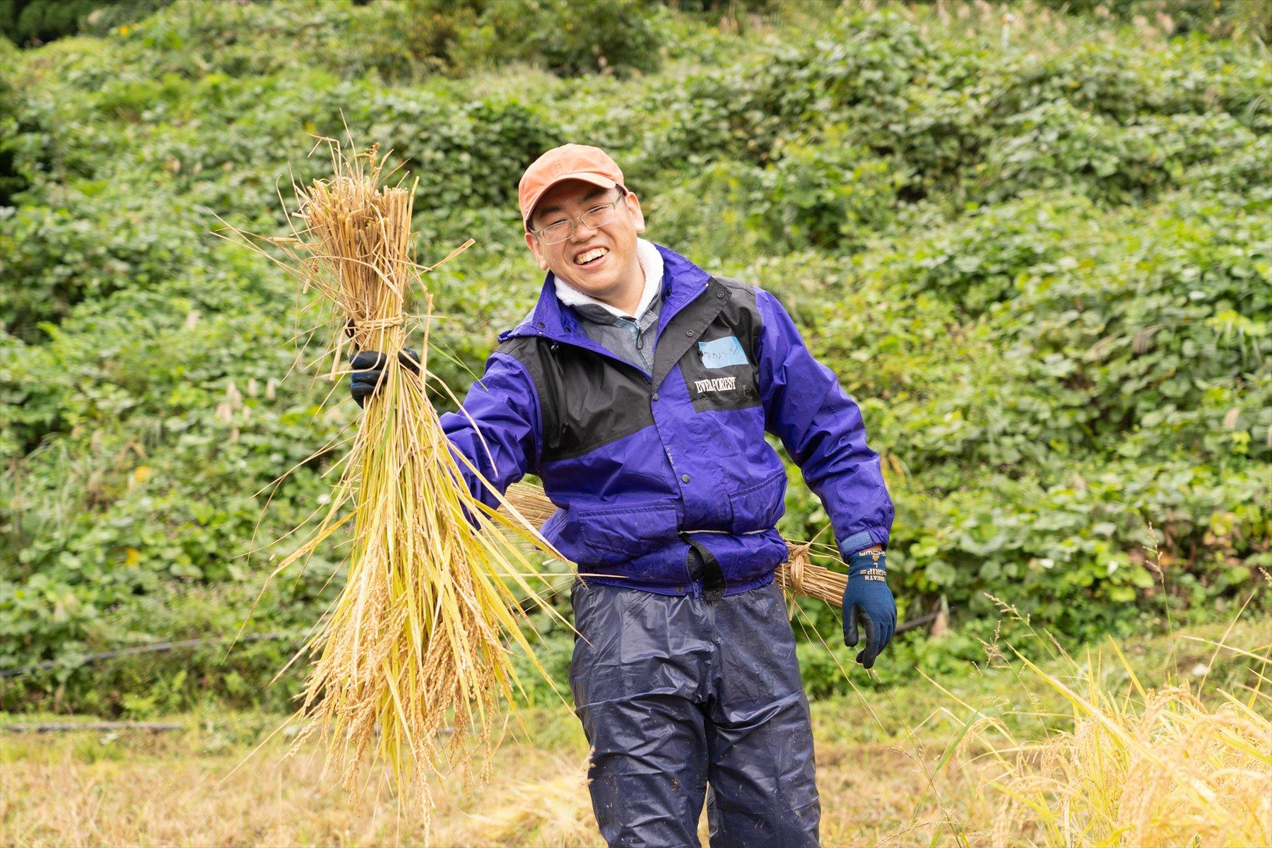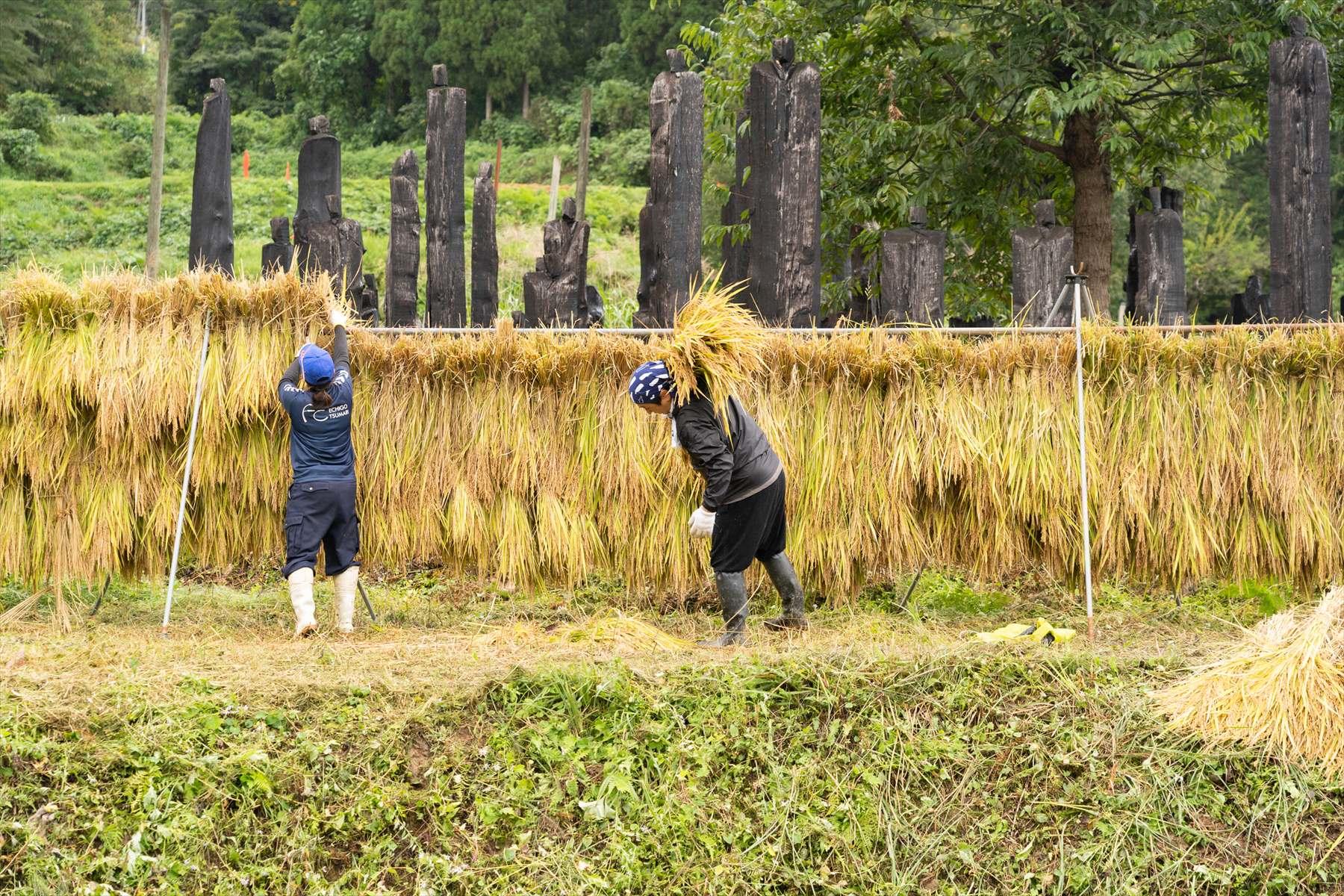 柏崎市から参加した高橋宏和さんは大のお米好きで、機会を見つけては田植えや稲刈りのイベントに参加して腕を磨いている。確かに田んぼでの身のこなしが違う。その彼が「とにかく天日干しの米は旨いんですよねえ。絶品です」と、とろけるような目で、はざにかかった稲穂を見つめている。
