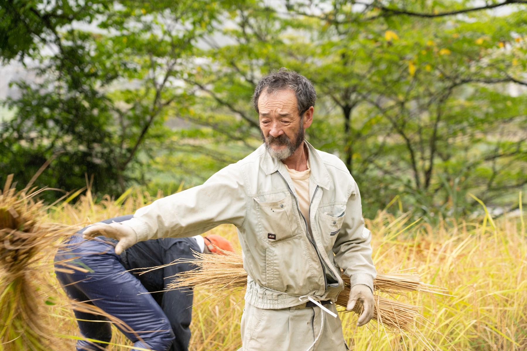 ところが雨模様になっても、いったん稲刈りに没頭したみんなに動揺はない。鎌をふるう手は止まらない。普段なら傘だ、雨宿りだ、となるところを、みんな濡れながらも黙々と作業を続けている。これが田んぼでの米づくりの不思議な魔力だ。ぼくもやめようという気にならない。