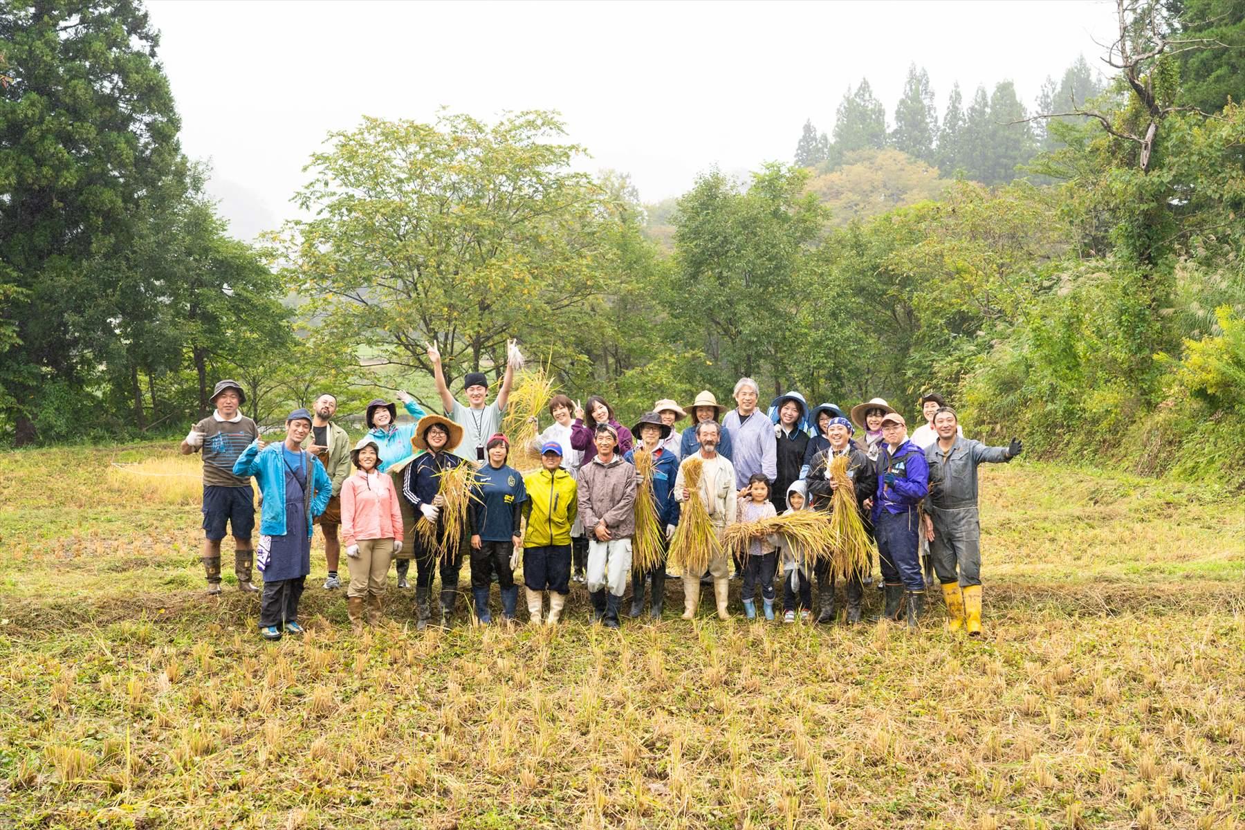 最後はチーム全員で記念撮影。これは田植えと同じ。田んぼの仕事はみんなの笑顔で始まり、みんなの笑顔で終わる。つまりチームワークなんだね。