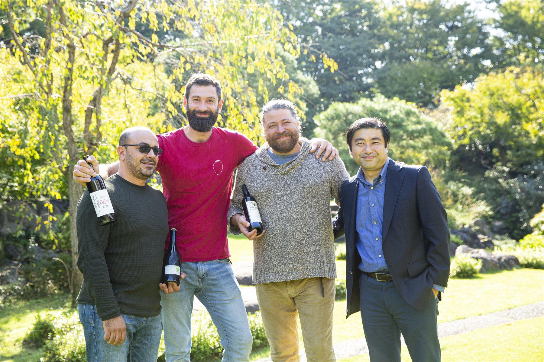 右から、若干29歳の「LAGAZI(ラガジ)」のショータ・ラガジさん。ジョージアワインを世界に広めた第一人者の「PHEASANT’S TEARS(フェザンツ・ティアーズ)」のジョン・ワーデマンさん。イギリス物理学博士号も持つ「OKRO’S WINE(オクロズワイン)」のジョン・オクロさん。