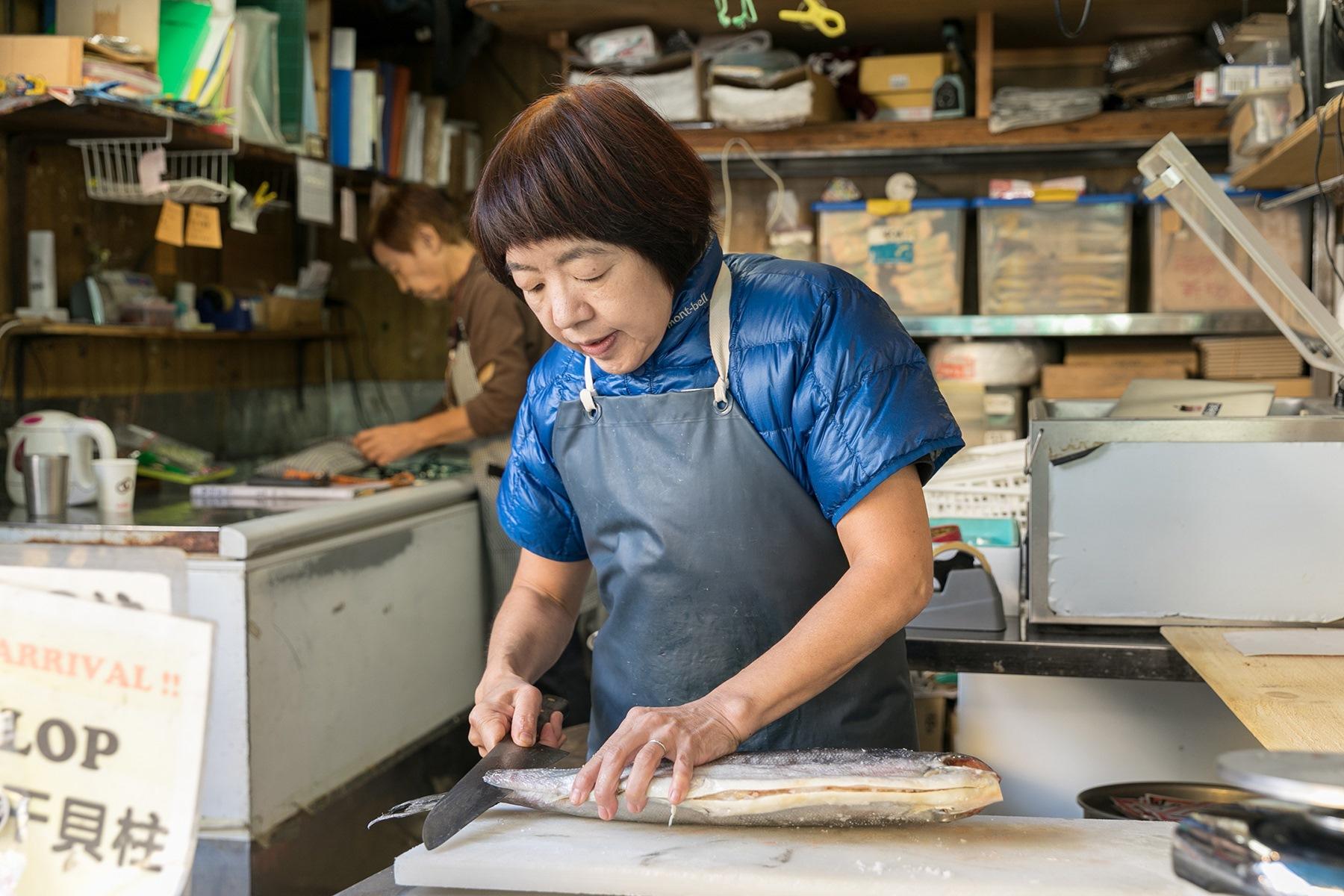 「一年中魚を切ったり触ったりするからね、とにかく袖口は清潔じゃないといけないの。だから、半袖にしてますね」