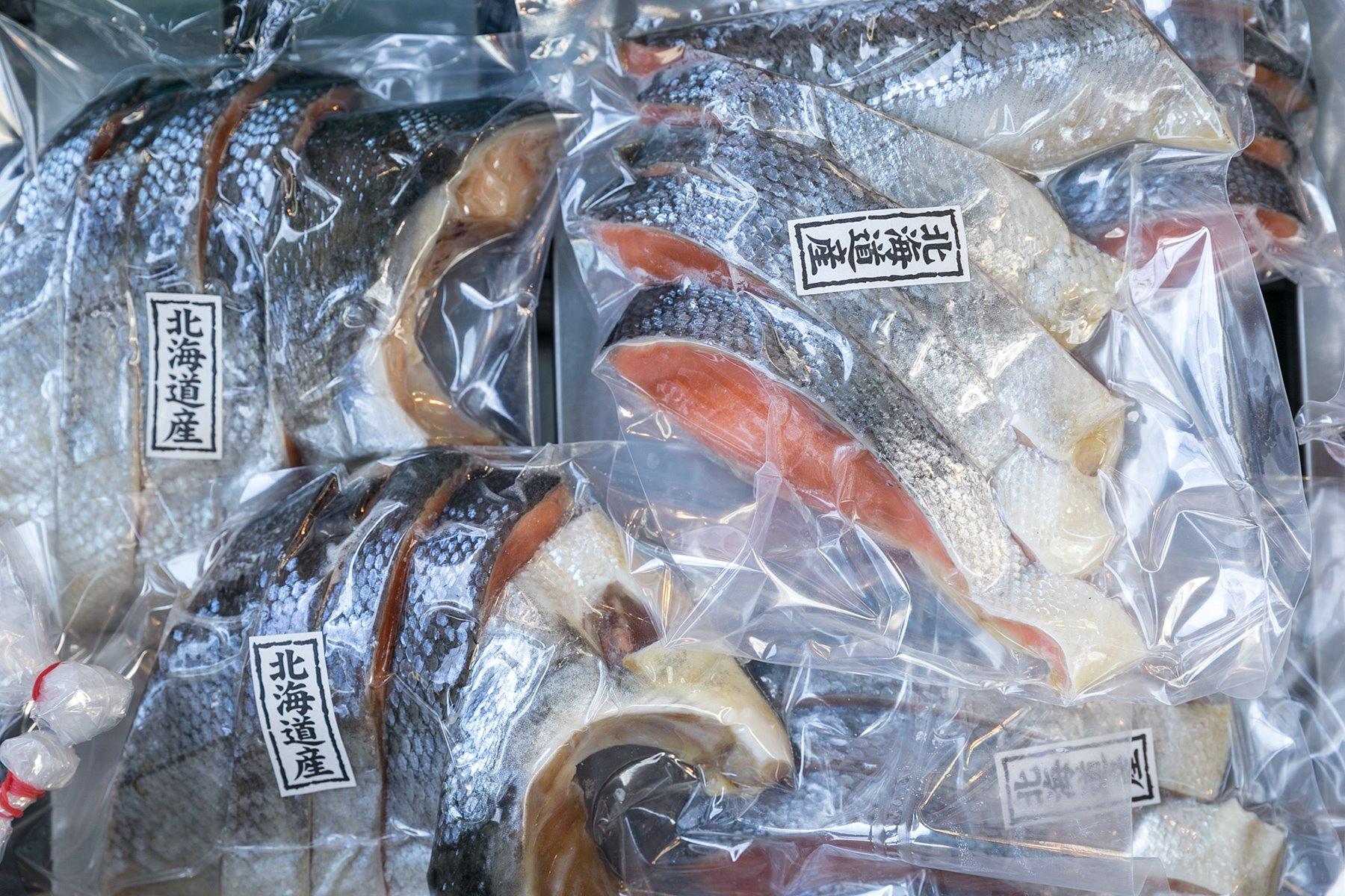小柄な体で、特大の鮭を、ザクッザクッと切りわけていく。迷いなく同じ厚みにカットする手元に見とれていると、あっという間に切り身が完成。それを手早く包装して、今度は注文先へ送る準備にとりかかる。魚屋はスピードが命。もたもたしていると、その分、鮮度が落ちる。