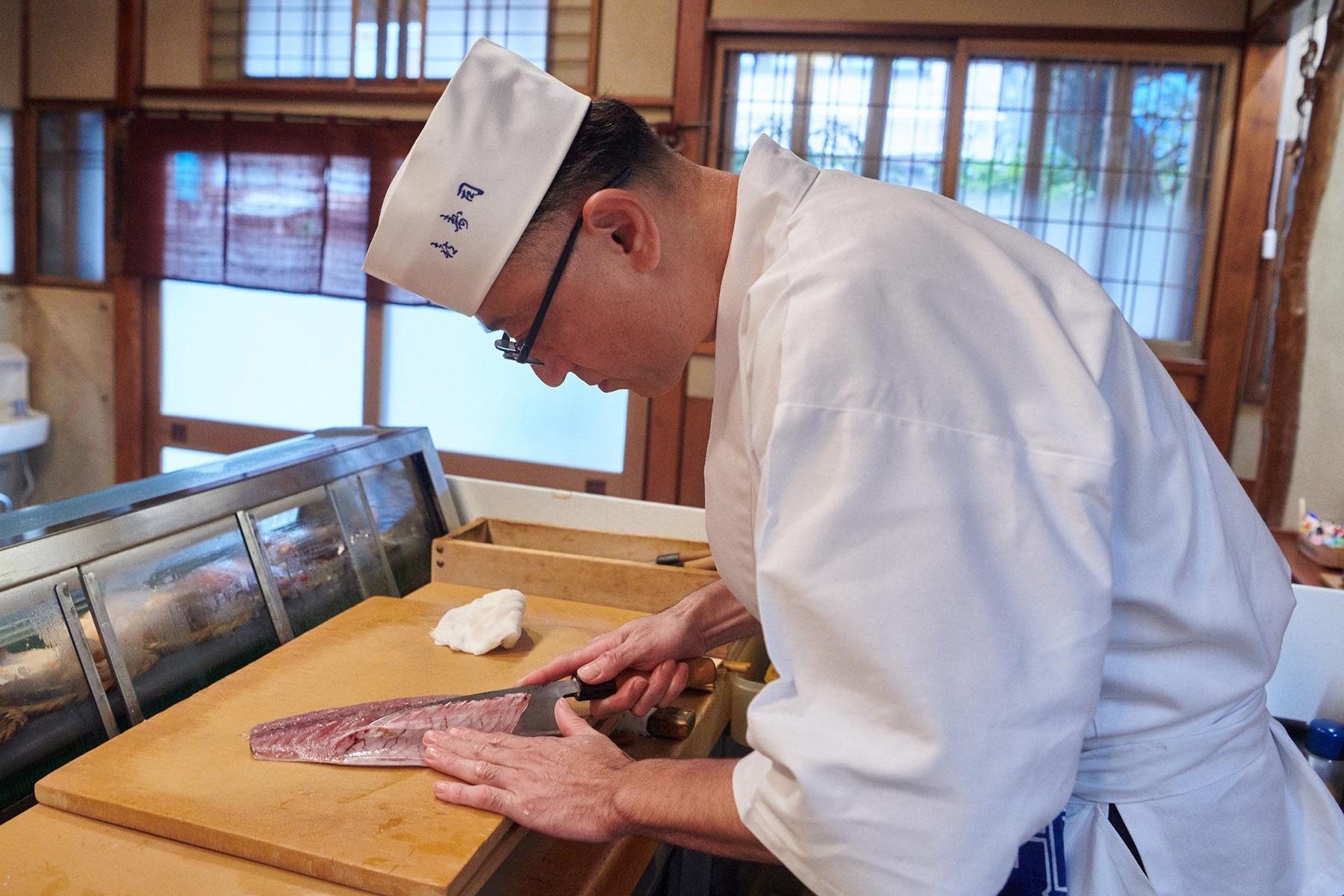 「豊洲で仕入れるのは1匹1kg程度の真さばですね。あまりにも大きいと握ったときにやぼったくなるので、これくらいが丁度いいんです。さばは全国の港で揚がります。西では福井の若狭などが有名ですが、店で使うのは青森や北海道など北の魚が多いです。同じ肉厚の魚でも身の張った硬い魚よりも、ぽってりとしていて柔らかい魚をうちでは使うことが多いです」