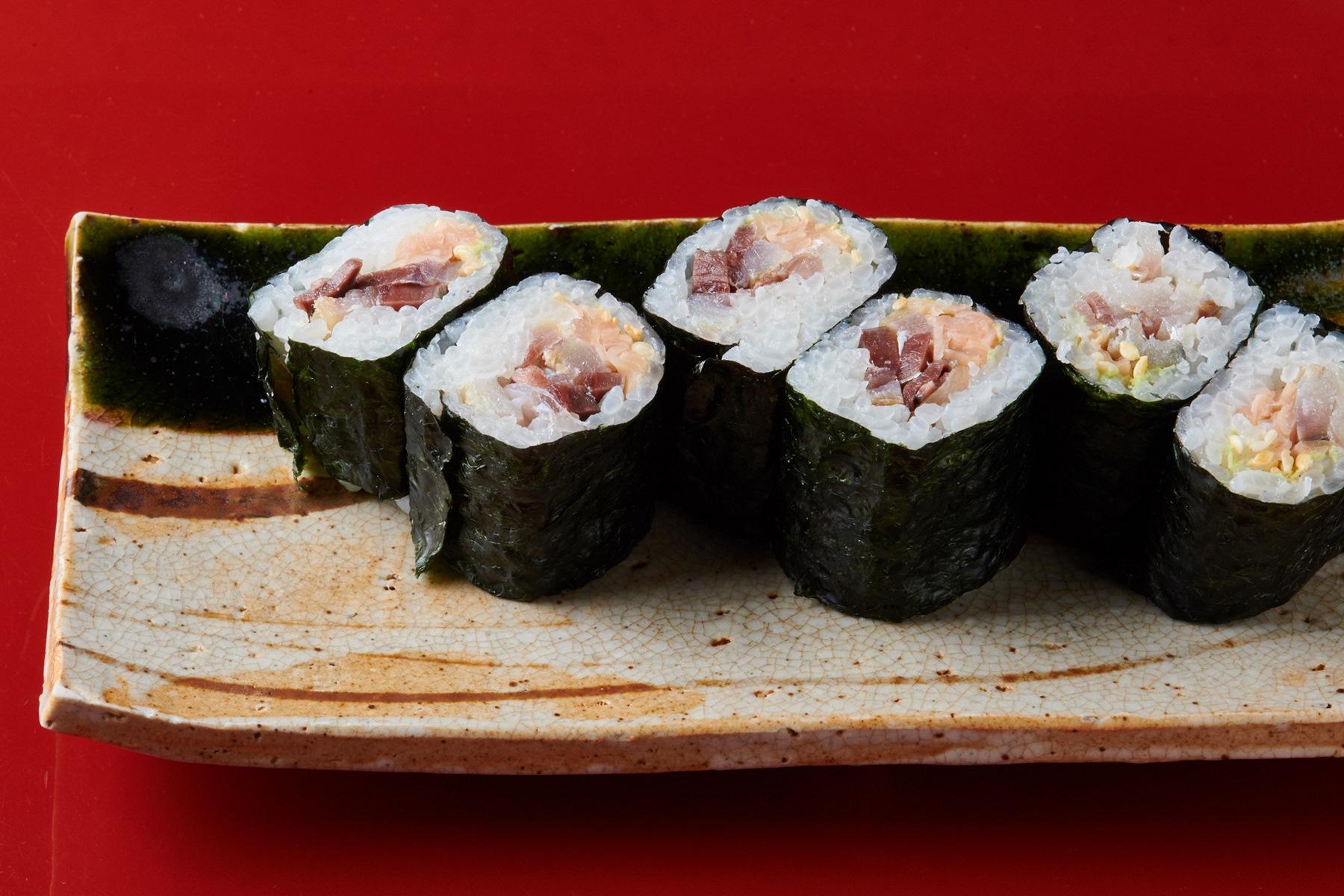「そもそも、〆たさばとガリを海苔巻きにしたのは、先代のオヤジで、仕事終わりに一杯やる時のアテだったんです。使うのはお客様には出せない尻尾に近い部分。ここは腹よりも身が薄いので、酢が余計に入っているのです。それを、包丁で、ガリと一緒にトントンと軽く叩いて、巻物にするんです。ガリのさっぱりとした味が、さばの脂と相まって、やみつきになります」