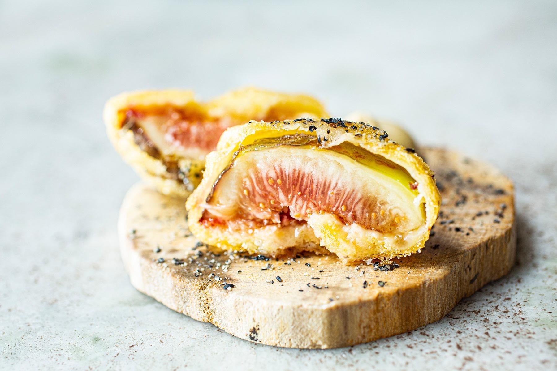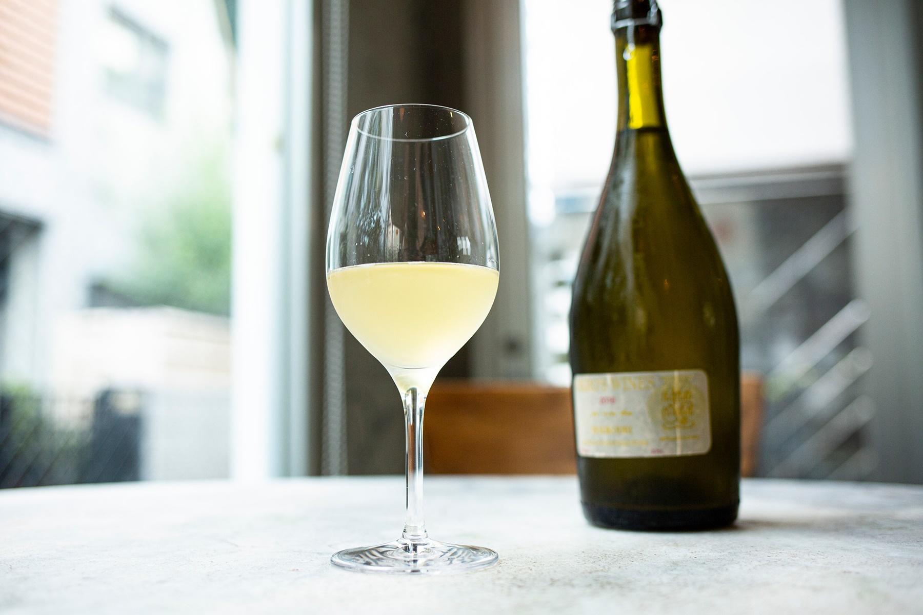 「イチジクのフリットです。この料理には、『OKRO’S WINE(オクロズワイン)』のスパークリングワイン『ツォリコウリ』を選びました。クヴェヴリという甕(かめ)で醸した、微発泡ワインです」と原田さん。