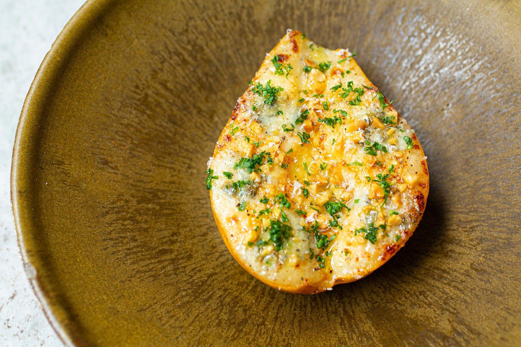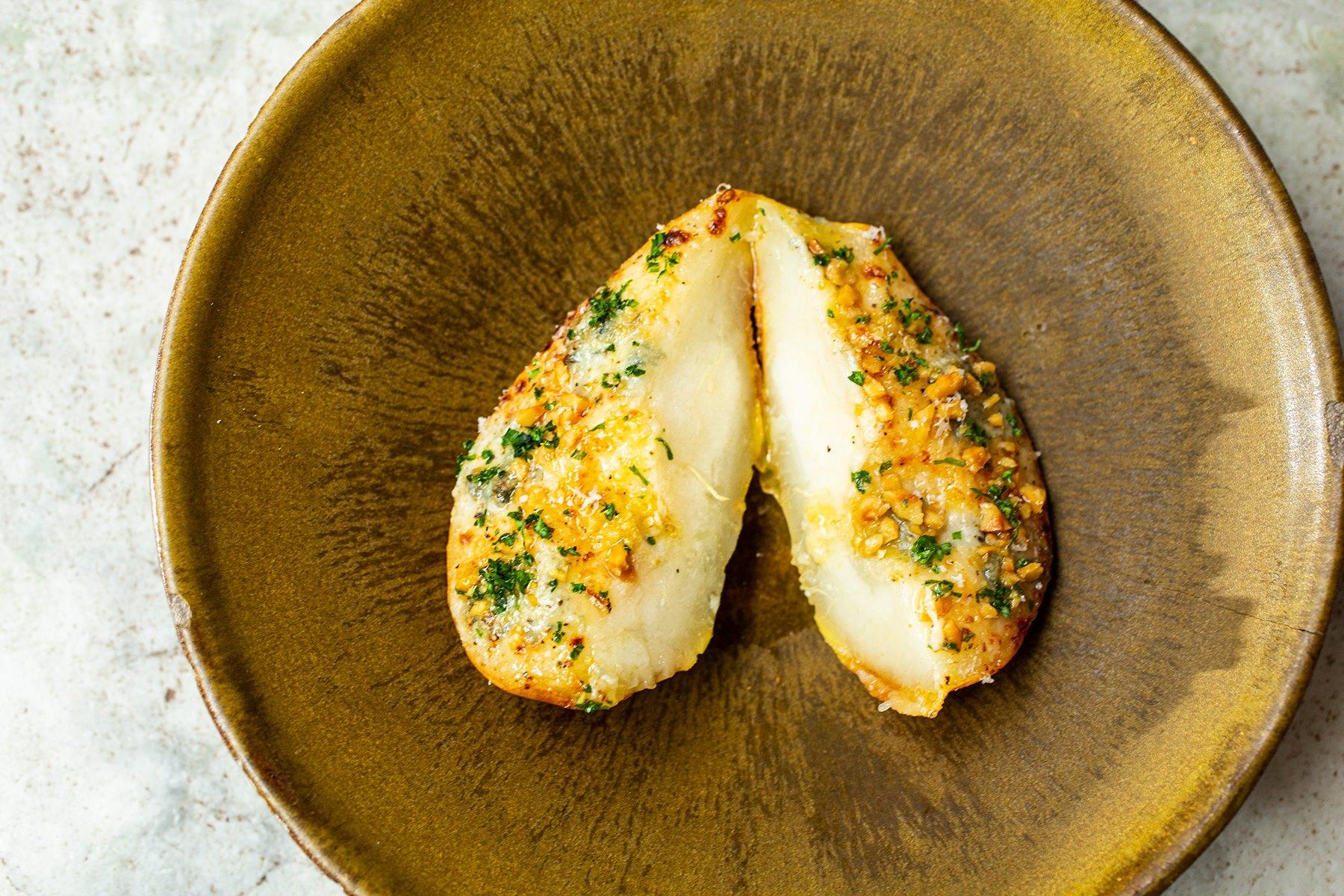 半分に切った洋梨にゴルゴンゾーラチーズをのせたものをオーブンで焼き上げ、みじん切りにしたパセリとクルミをあしらってあった。