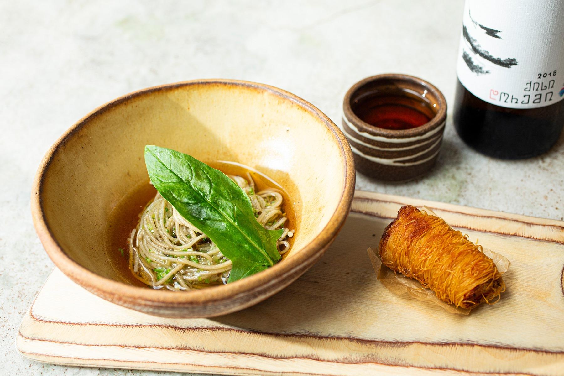 「ジョージアのオレンジワインの風味は、ほうじ茶や紅茶に近いと思っています。そのためスープはほうじ茶とカツオだしの麺つゆでつくりました。山形のこんにゃくそばにオクラ、ザーサイ、塩昆布を和えてあります。カダイフはトルコで使われている極細の麸のことで、スズキに巻いて揚げました」