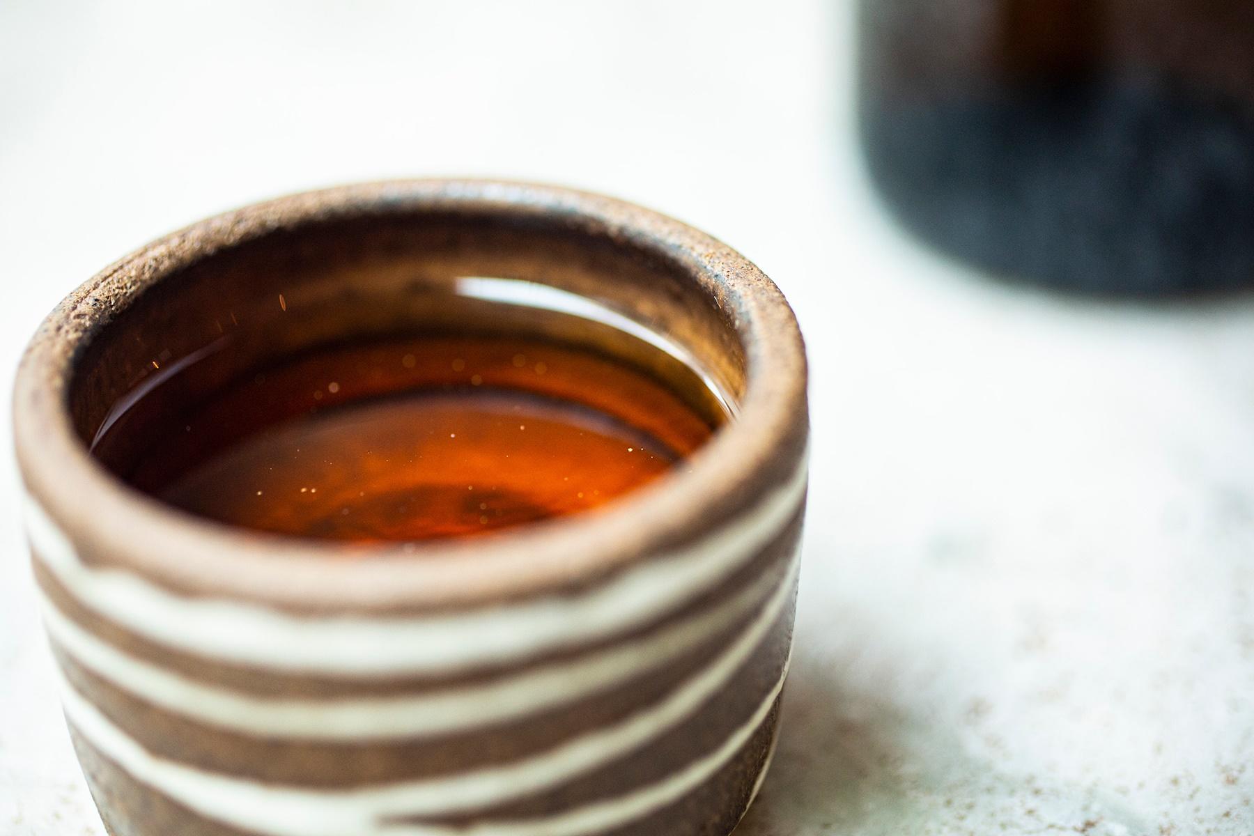 「お茶を使ったスープには、酸味が穏やかなワインを合わせたかったので、ドレミを選択しました。ぐい呑は素焼きです。ジョージアでも素焼きの器でワインを飲む人がいるので、素焼きのぐい呑を選びました。素焼きの器で飲むと酸味が柔らかくなる気がするんですよ」