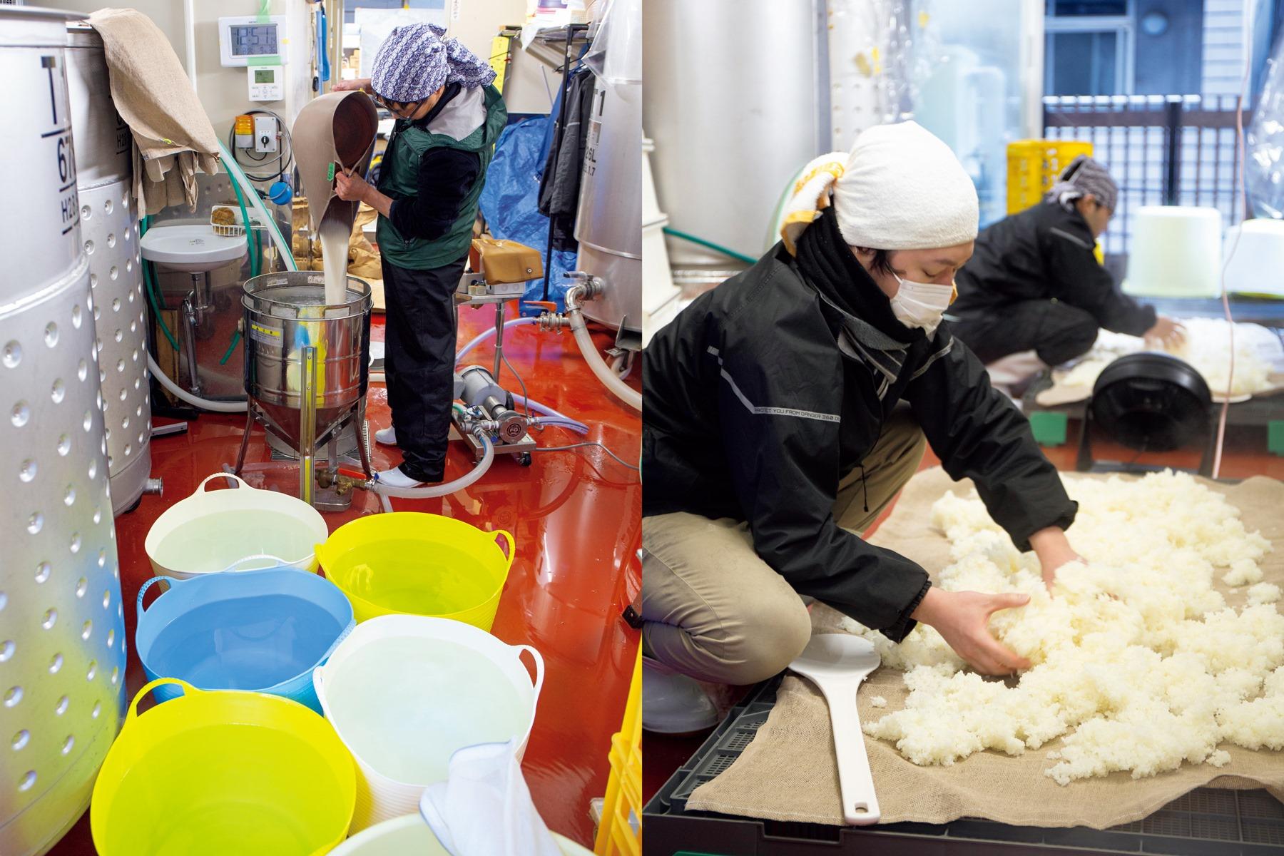 清酒免許を取得するや、齊藤さんは自宅を別の場所に移し、4階建てビルを清酒蔵に改装。現在の蔵は、4階には米を蒸す甑(こしき)と麹室、3階に仕込みタンクと分析室を兼ねた事務室、2階に仕込みタンクと搾り機(洗米もここで)、1階は貯蔵タンクとなっている。米や麹の移動は階段を使い、醪(もろみ)の移動は床に開けた穴にホースを通して階下へ。酒母はタンクごと、ベランダからウィンチを使って上げ下げし、タンク下につけた滑車でゴロゴロ移動する。「うちは暖気(だき)樽(温度を調整するために酒母に入れる湯入りの樽)は使わないんです。53Lのタンクごと、部屋を移動させます」。小さな蔵の小さな仕込みだからこそできる荒業だ。