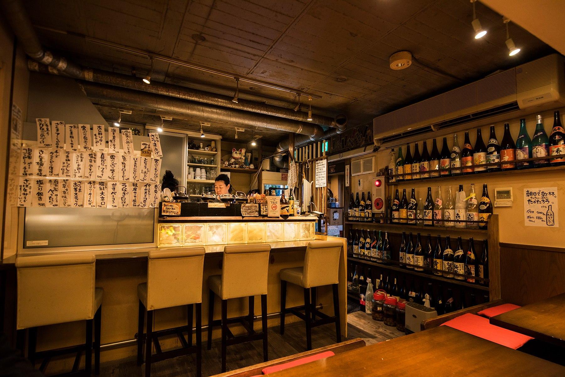 そして2006年に浅草で独立。100本の選び抜かれた焼酎と数種類の日本酒は、ほとんどが500円均一! 料理も九州・沖縄のものが多い。店名は「いいことが末広がりに」という意味だ。