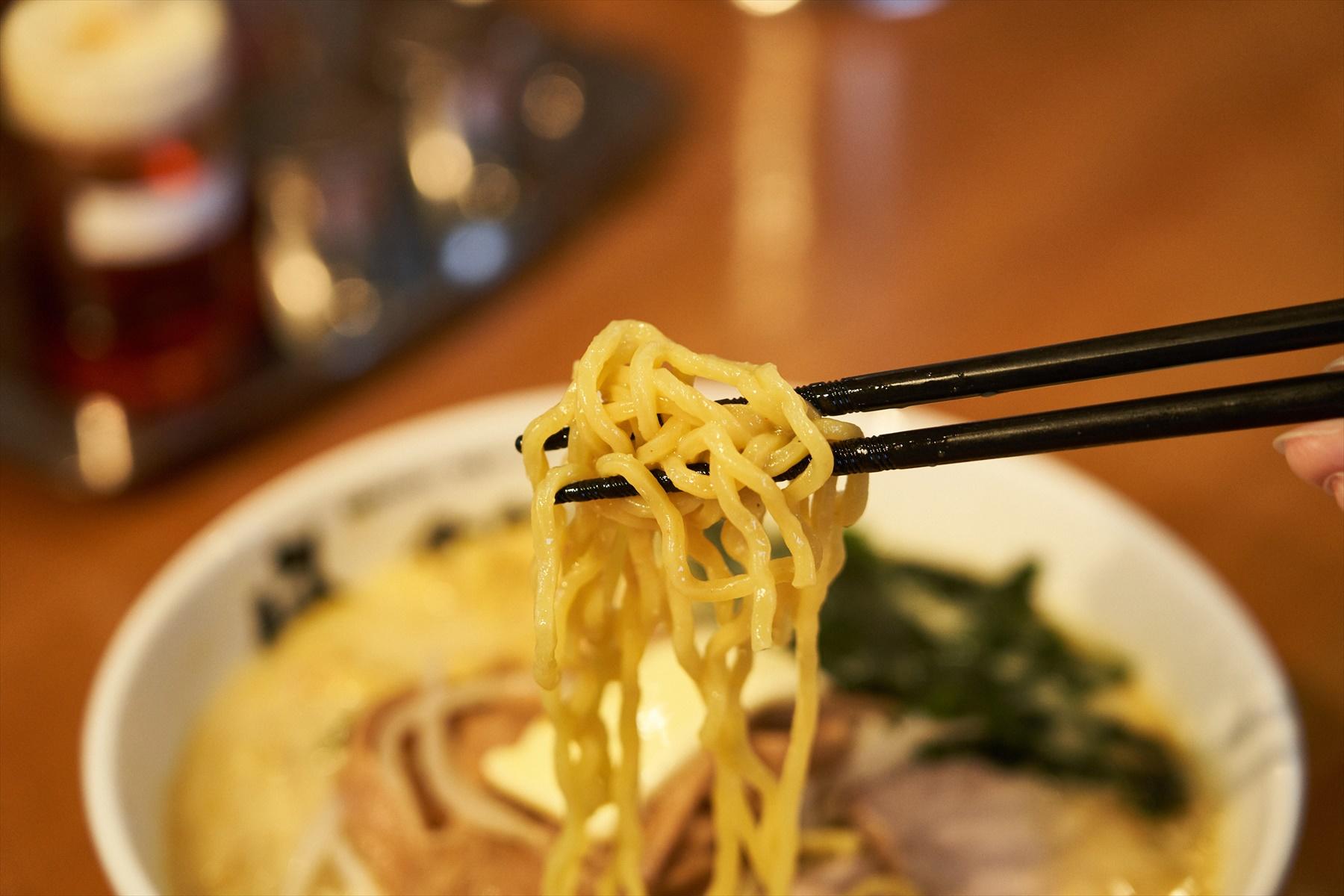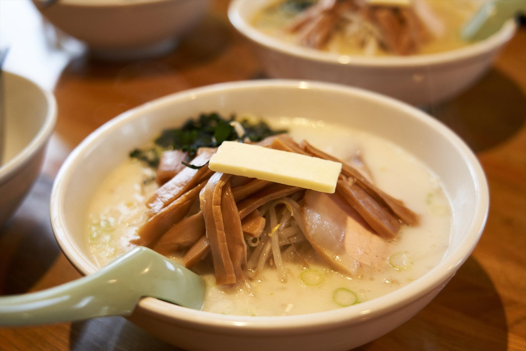 麺は、ルーツである札幌ラーメンと同じ中太のちぢれ麺。スープがしっかりと絡んで、モチモチとした歯ごたえが気持ちいい。味噌のコクが広がり、トッピングのバターが溶けてゆくごとにまろやかさが増して、スパイス効果で後味は爽やか。タイの、カレースパイスを使うココナッツミルク入りラーメン“カオソーイ”にどことなく通じるものがあって、ちょっぴりアジアンテイスト。これは、ハマる味わいだ。