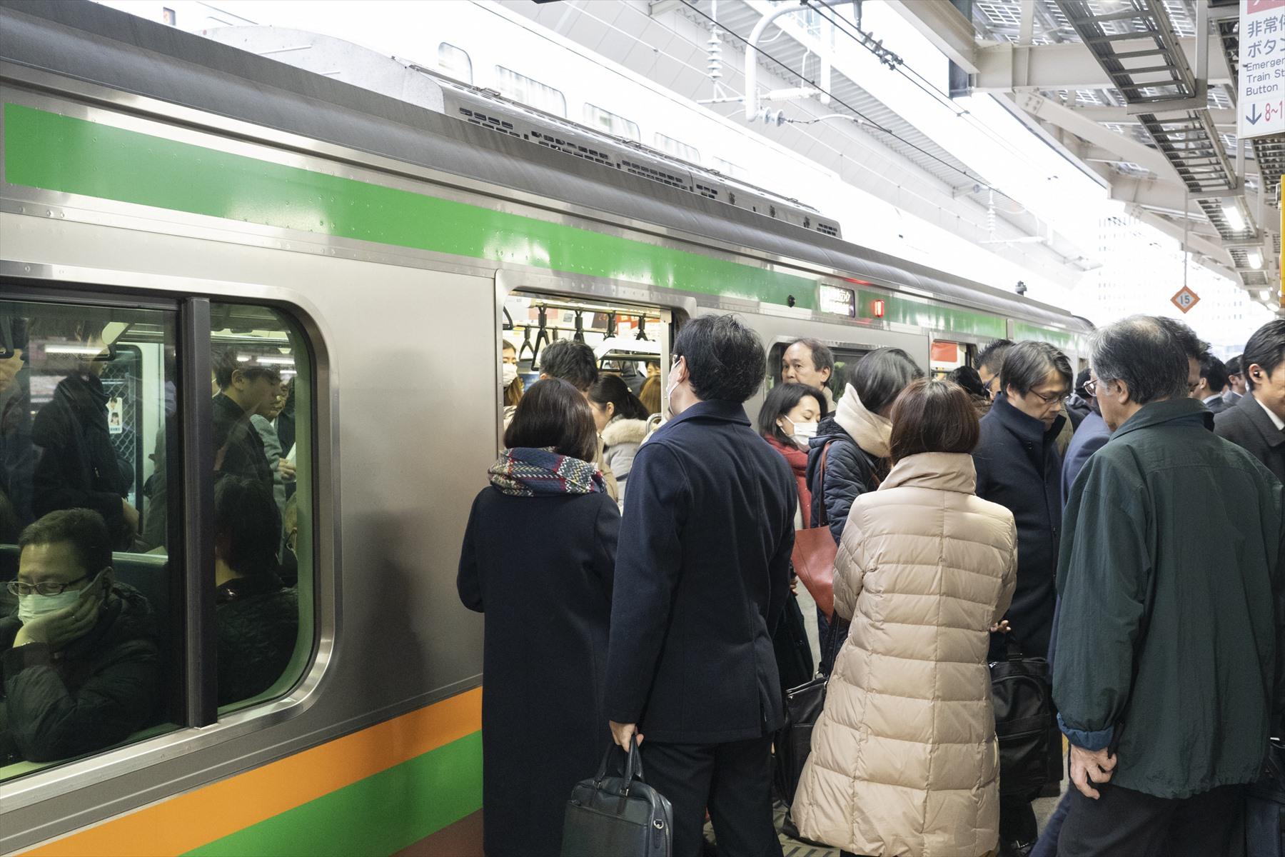 超スローペースでようやくホームに着くと、スーツを着たサラリーマンばかりだ。旅情もへったくれもない。満員電車に押し込められるように熱海行きの列車に乗った。