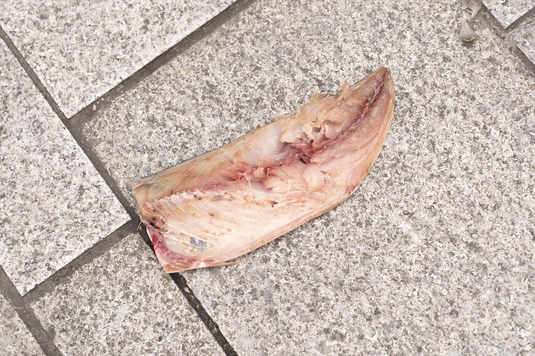 駅から歩き始めると、大きな鯖の半身が歩道に落ちていた。