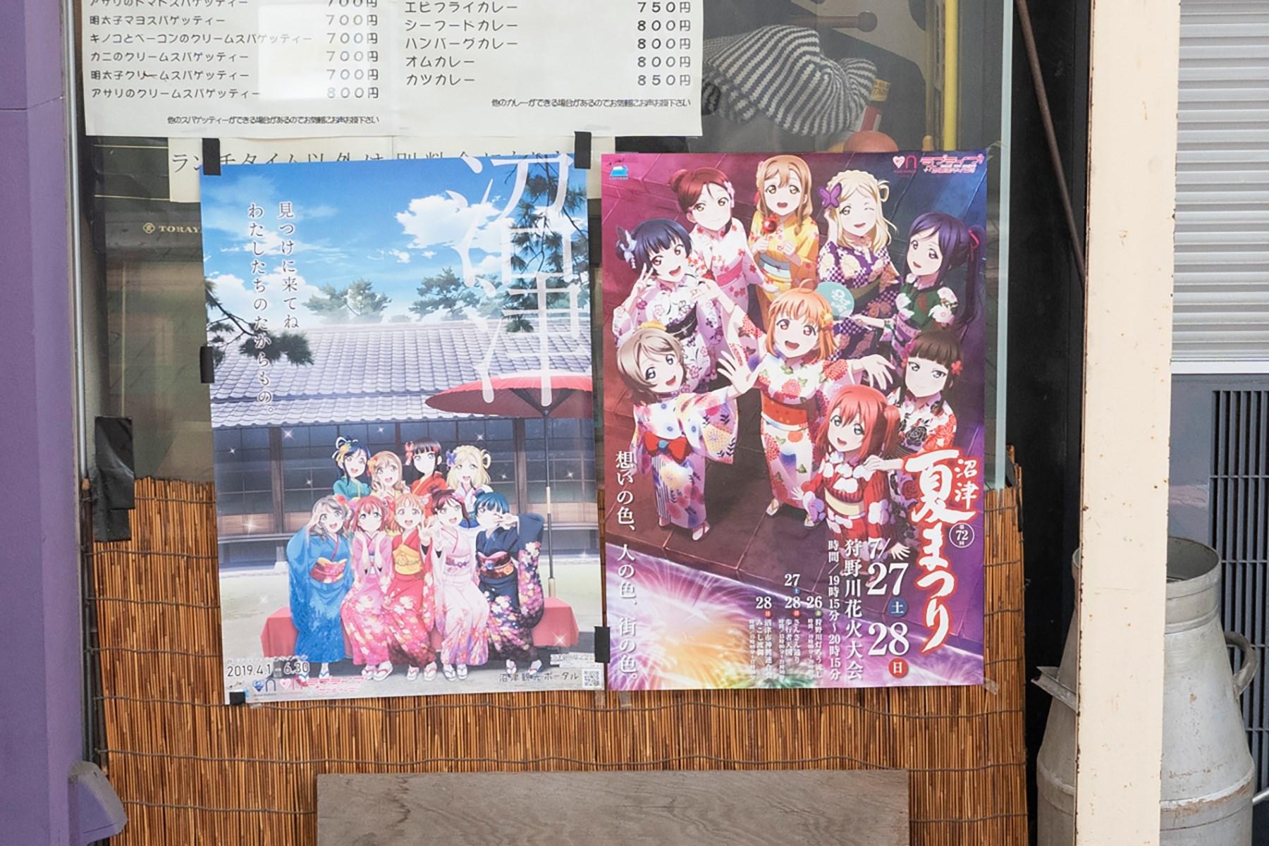 沼津のアーケードに入ると、アニメと思しき美少女キャラの横断幕がかかっていた。揃いのコスチュームを着た女子が9人並んでいる。この町が舞台のアニメだろうか。「ラブライブ!」というタイトルが見える。ライブというぐらいだから、アイドルの物語なのかな。