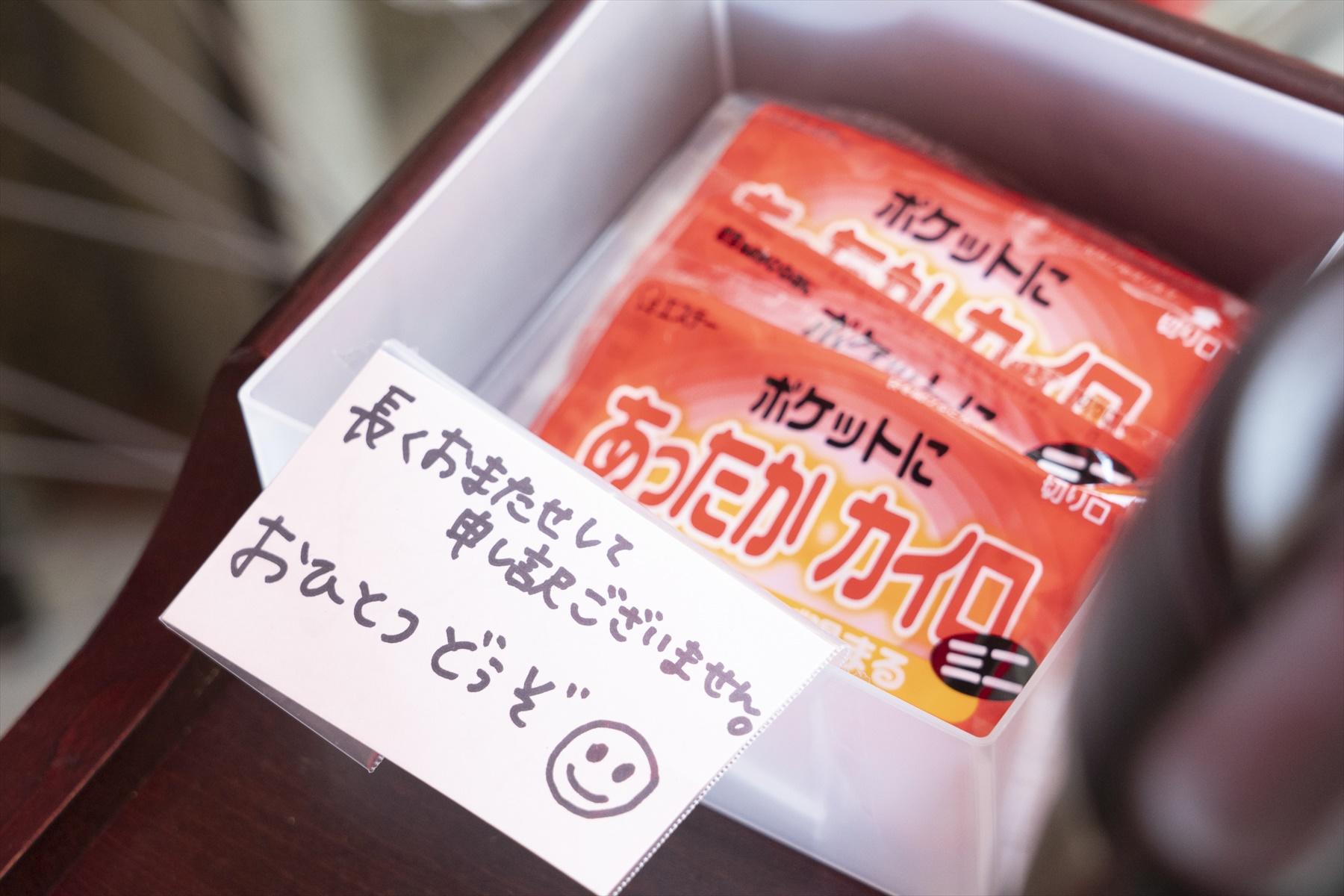 「申し訳ございません。もう少々お待ちください。トイレは店の中にあります。またこちらに使い捨てカイロとお茶もございますので、どうぞご利用ください」