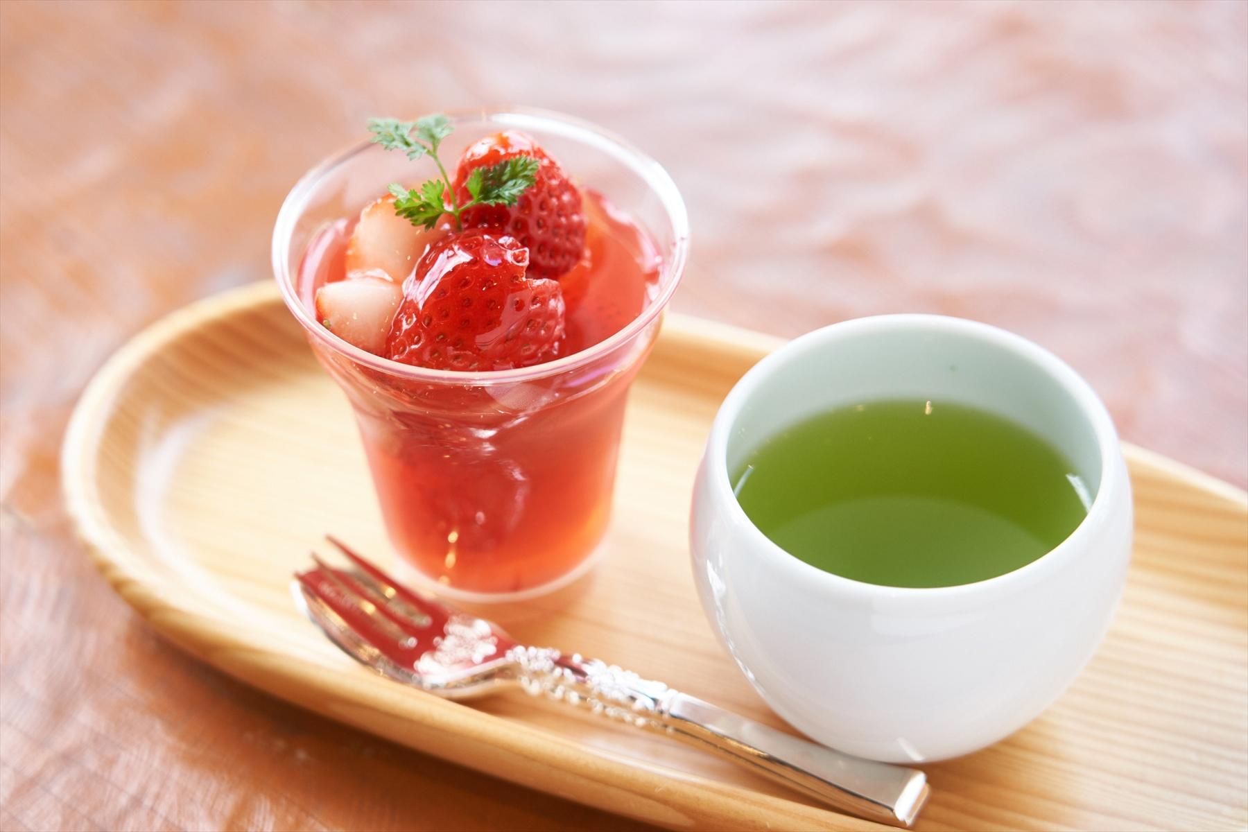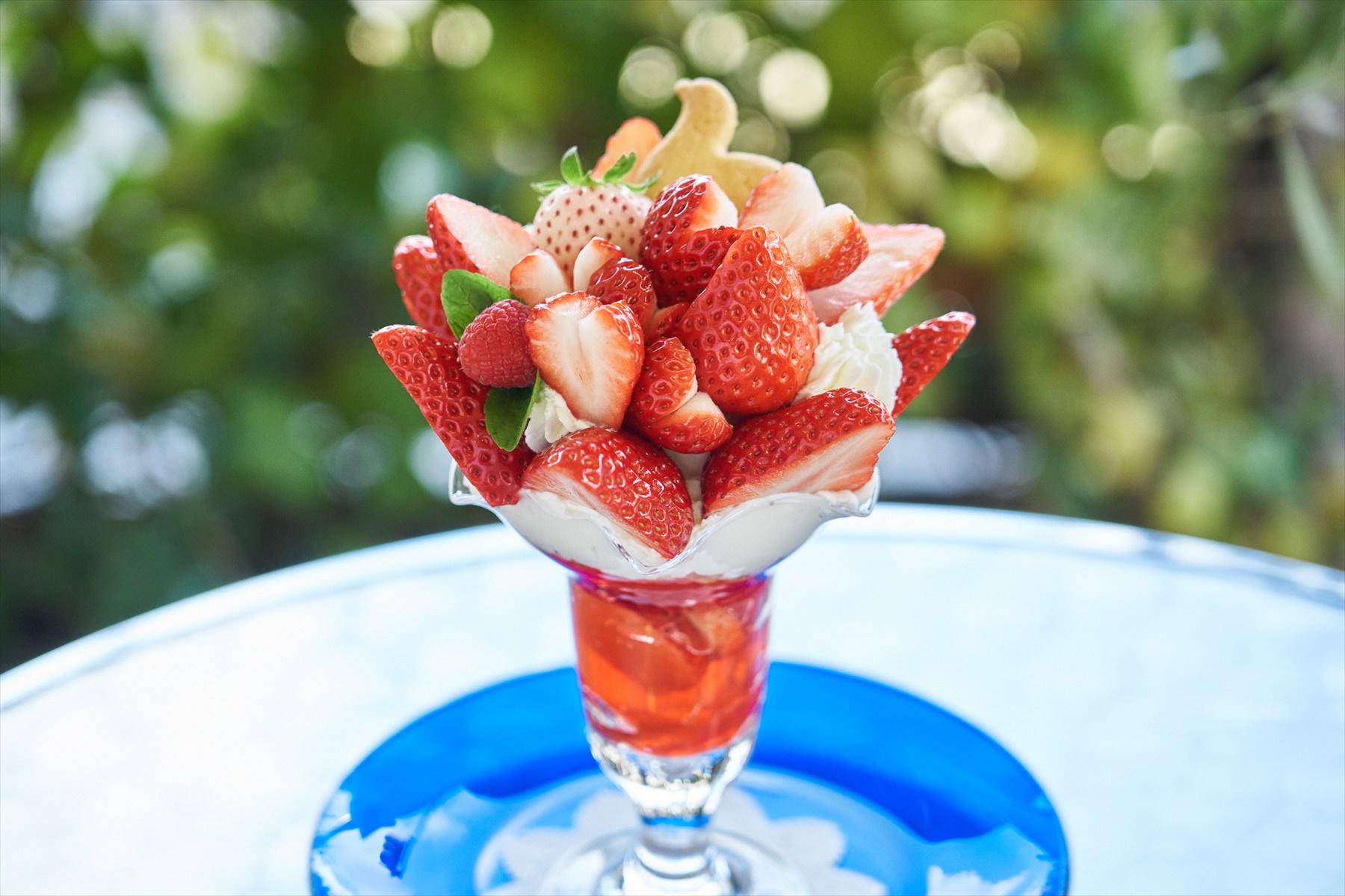 そんな自慢の果実をストレートに満喫できるカフェメニューが、「いちごたっぷりパフェ」だ。そのたっぷり感といったらハンパじゃない。イチゴの自家製寒天をベースに、“紅ほっぺ”や“貴婦人の微笑み”などの4品種をあふれんばかりに盛り込んだビジュアルは圧巻!