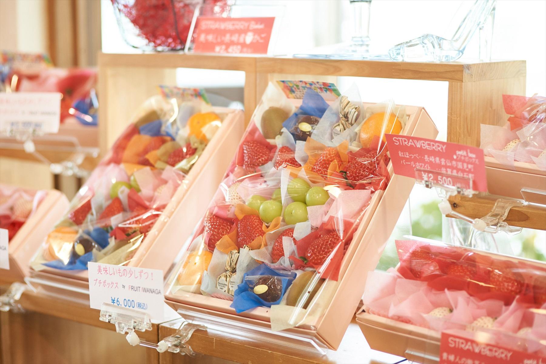 おしゃれな店内に一歩足を踏み入れると、きれいに陳列された選りすぐりの果物がずらり。さまざまな品種の長崎県産イチゴも並んでいる。
