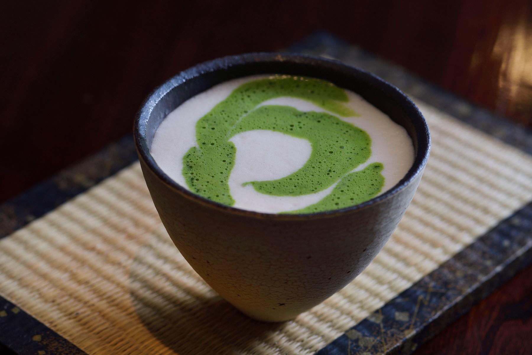 「栗の風味を生かしながら、ラフロイグというピートのきいたウイスキーと芋焼酎を『だし』と捉え、抹茶で野菜の旨味を表現しています。ラフロイグは『隠し味』の役割も担っています。芋焼酎ではなく、ダークラムやコニャック、グランマニエで表現しても美味しいと思います。でも和栗の味わいは儚いもので、洋酒にマスキングされて壊れてしまうんですよ。それに気づいたときに、あ、焼酎でやってみようと。修業先が鹿児島だったので、昔から焼酎のカクテルはつくっていてなじみがあるんです。」