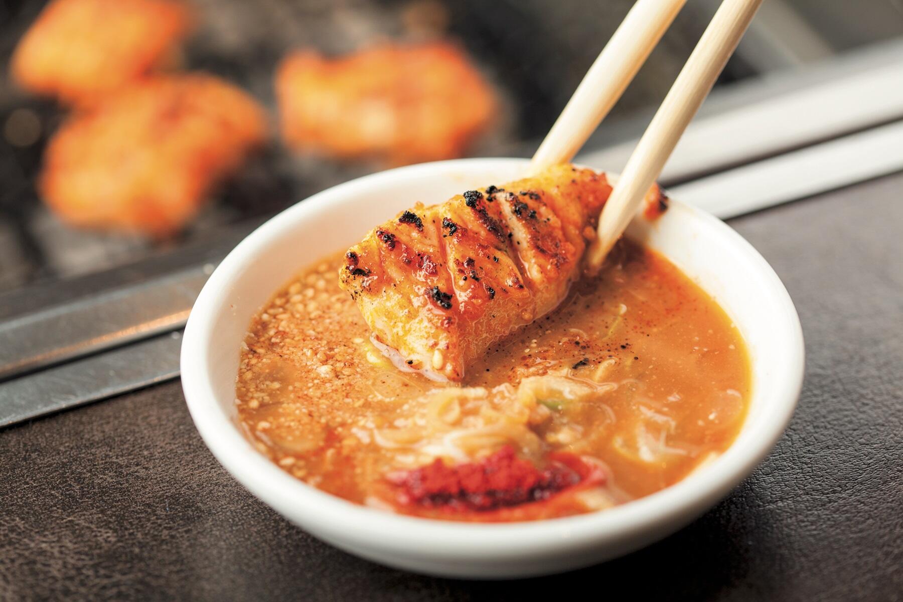 次なる一枚はタレにトプッとつける。滴るタレごとライスにのせ、大口を開けて豪快にかっ込む。これぞ至福......。
