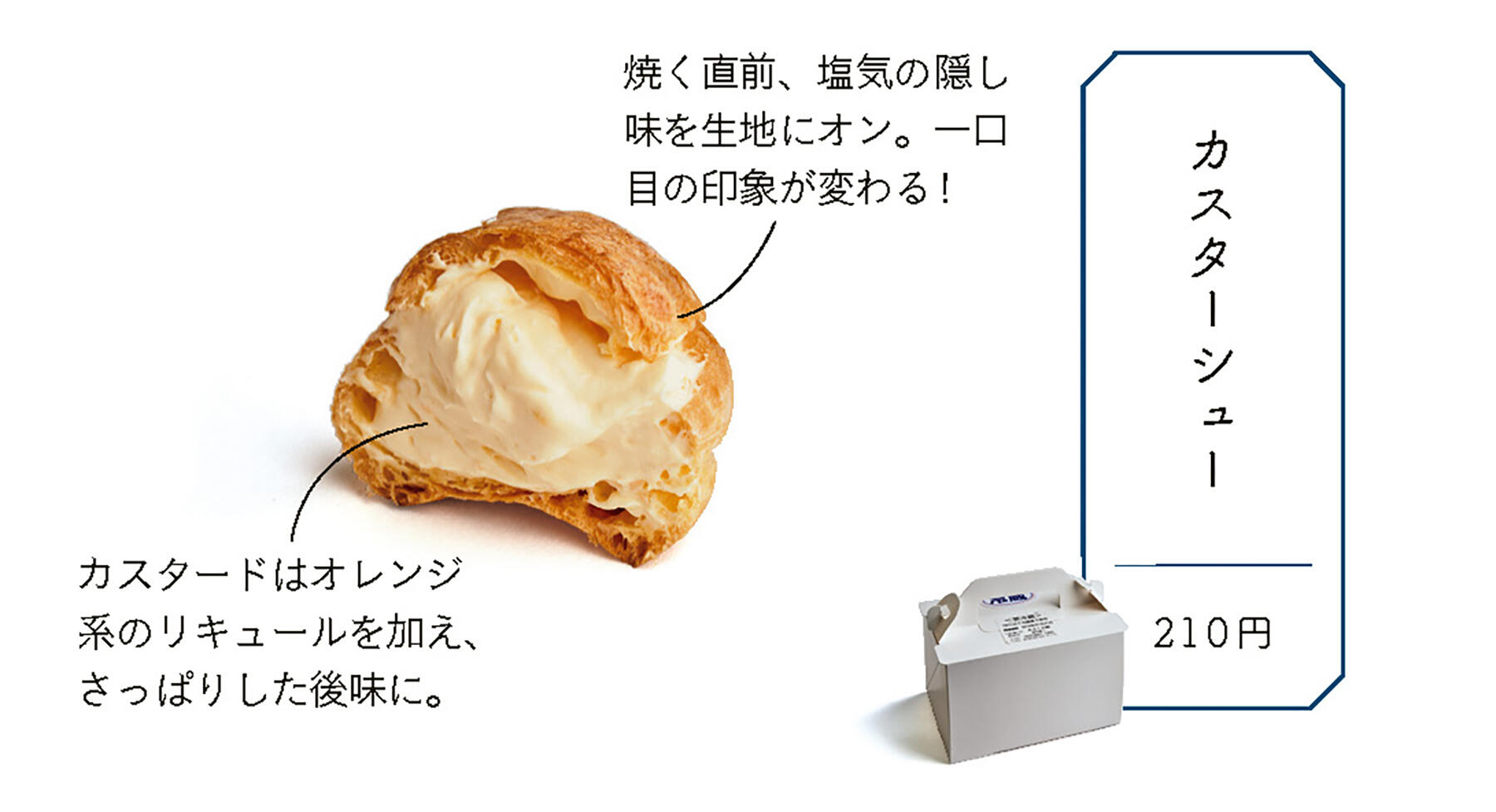 田中政二さんにとって、シュークリームの主役は“皮”。最も大切にしているのは、卵のやさしい味わいだ。卵と小麦粉の一般的な比率よりはるかに卵を増やして、風味を強調している。その分、オーブンにつきっきりで焼き具合を確認する手間がかかるが、それでも構わない。カスタードは、皮の風味が引き立つよう、さっぱりめでミルキーな味に仕上げた。