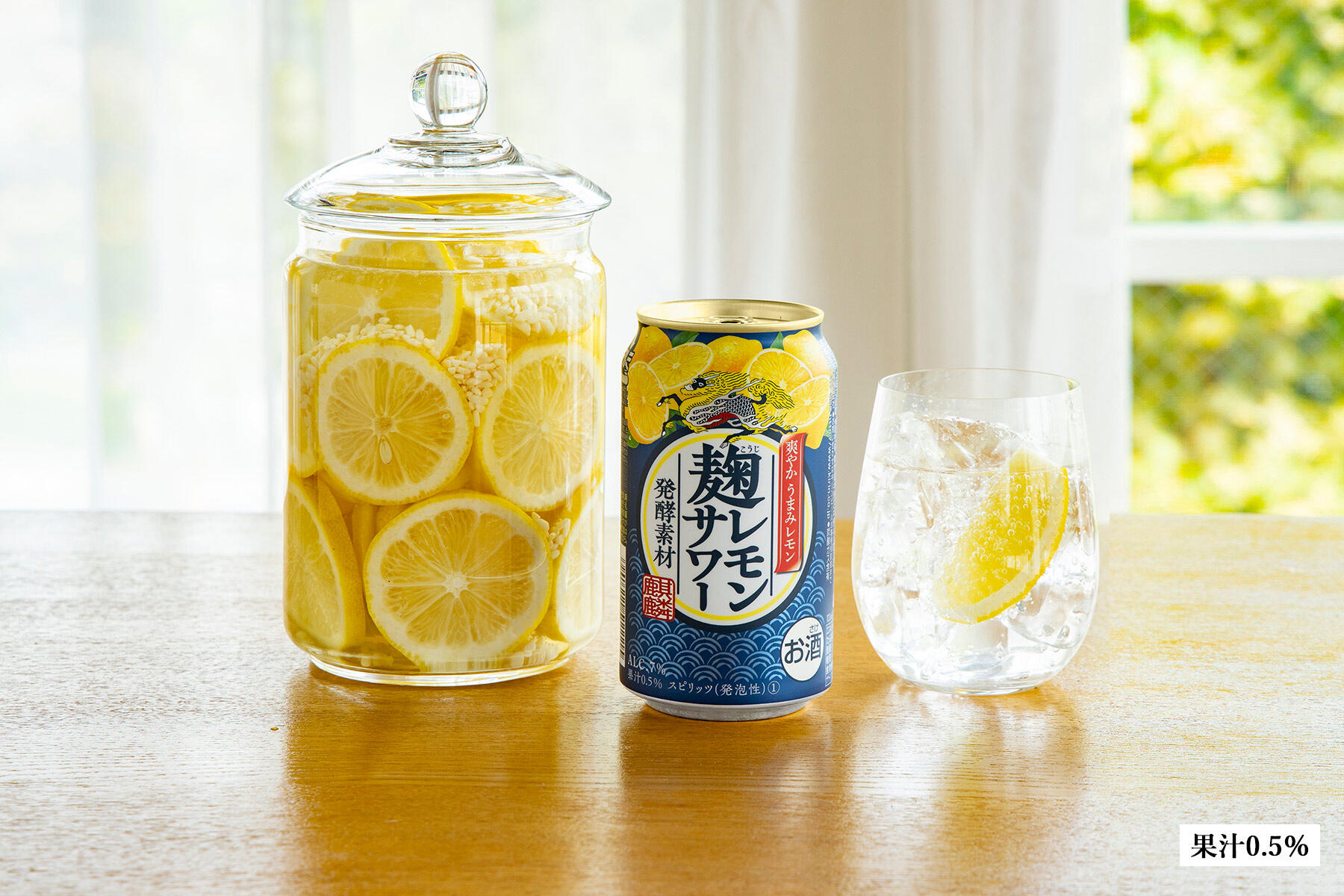 新発売の「麹レモンサワー」。日本の発酵文化を支えてきた麹を皮ごと搾りレモンに合わせることで、うまみという新しいレモンサワーのおいしさを実現している。※米麹抽出物使用