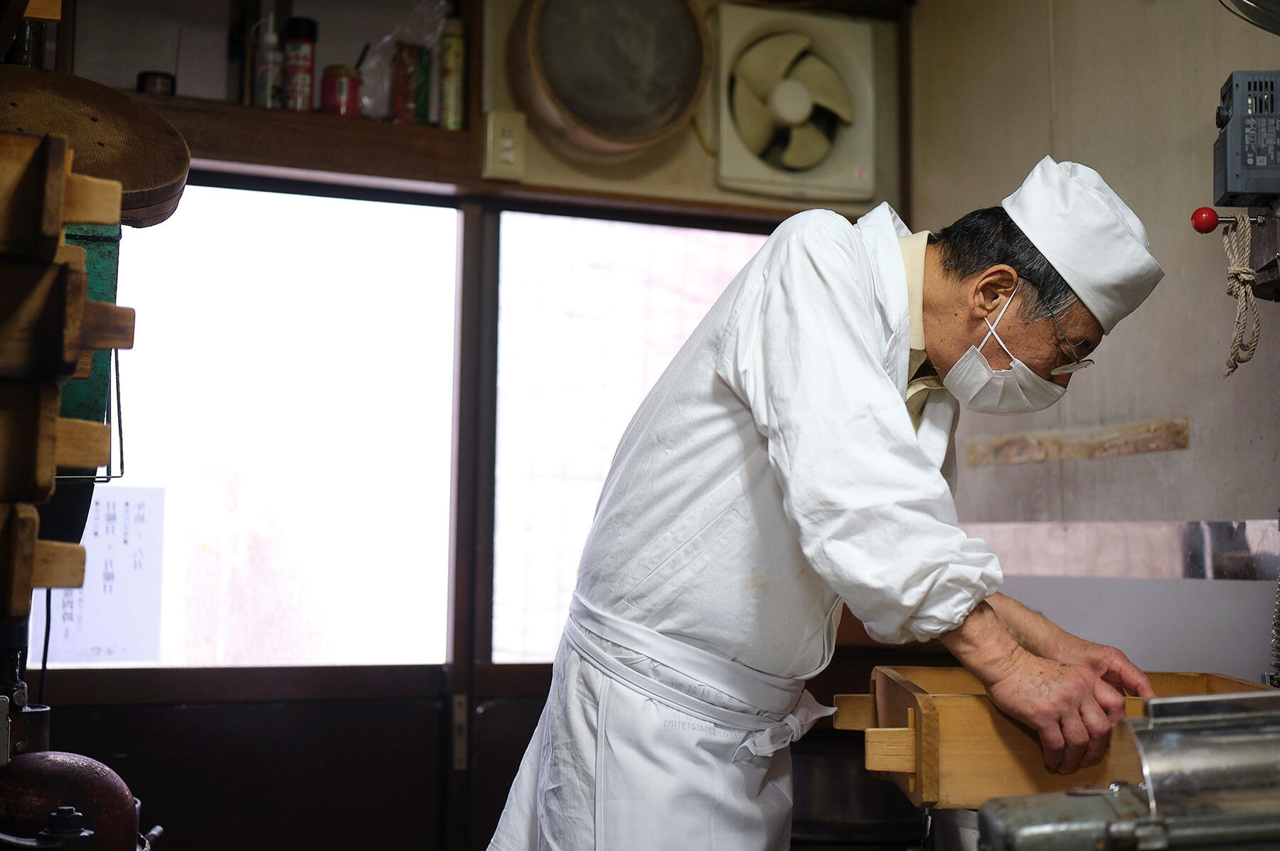 そこに、丸めた生地を入れては抜き、を繰り返す。木型に餡がくっつきやすいから、手際よく、リズムよくやらないときれいな形にはならない。一つ抜くごとに、上の型と下の型をそれぞれ濡れ布巾でていねいに拭く。手間と根気のいる作業。