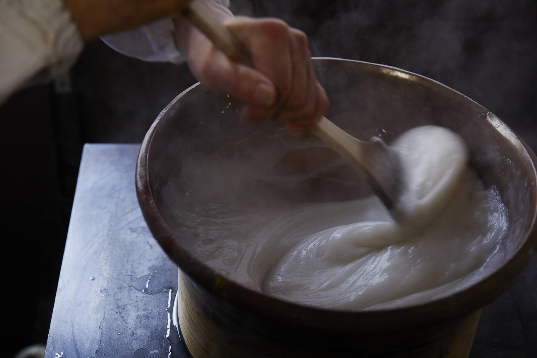 「さわりの中は、熱が伝わった部分から固まって貼り付いていくから、全体が固まったら蒸し器に移します。さわりで練るのは、あくまでも固めるため。しっかりと熱を入れるのは、せいろの蒸気で。これが上菓子の葛の扱いです」と主人。